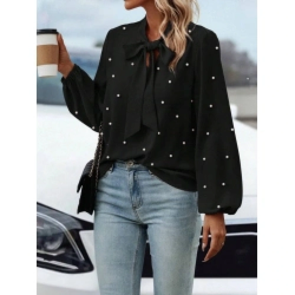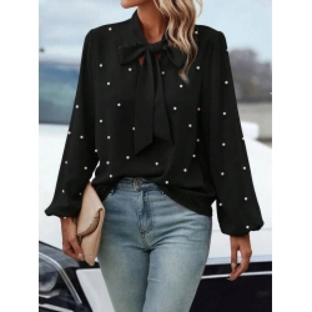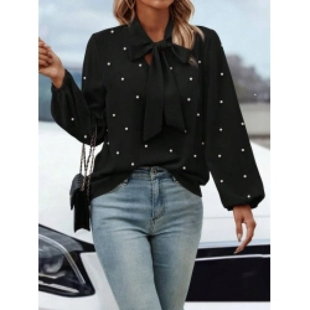 Kadın Uzun Kollu Yakadan Fiyonklu Incili Ithal Krep Bluz