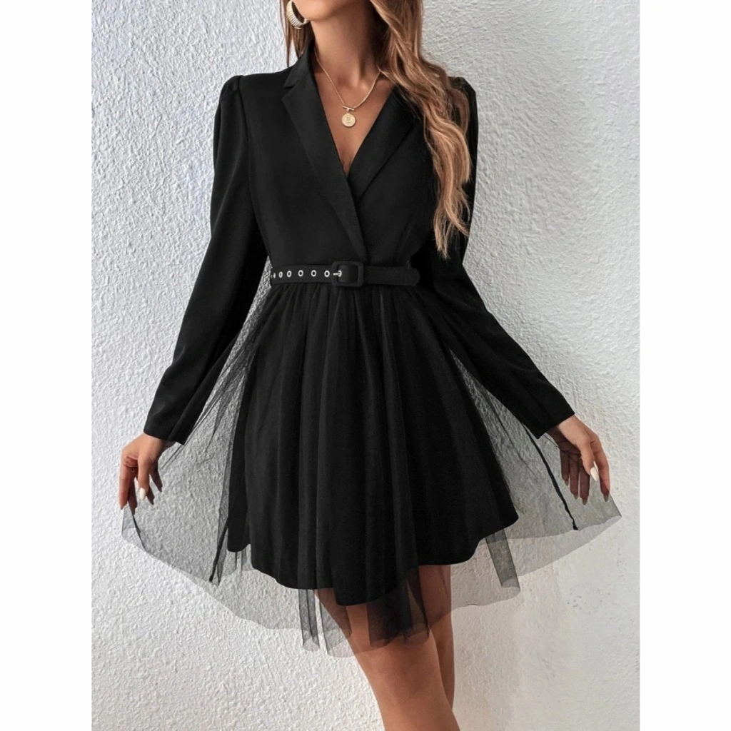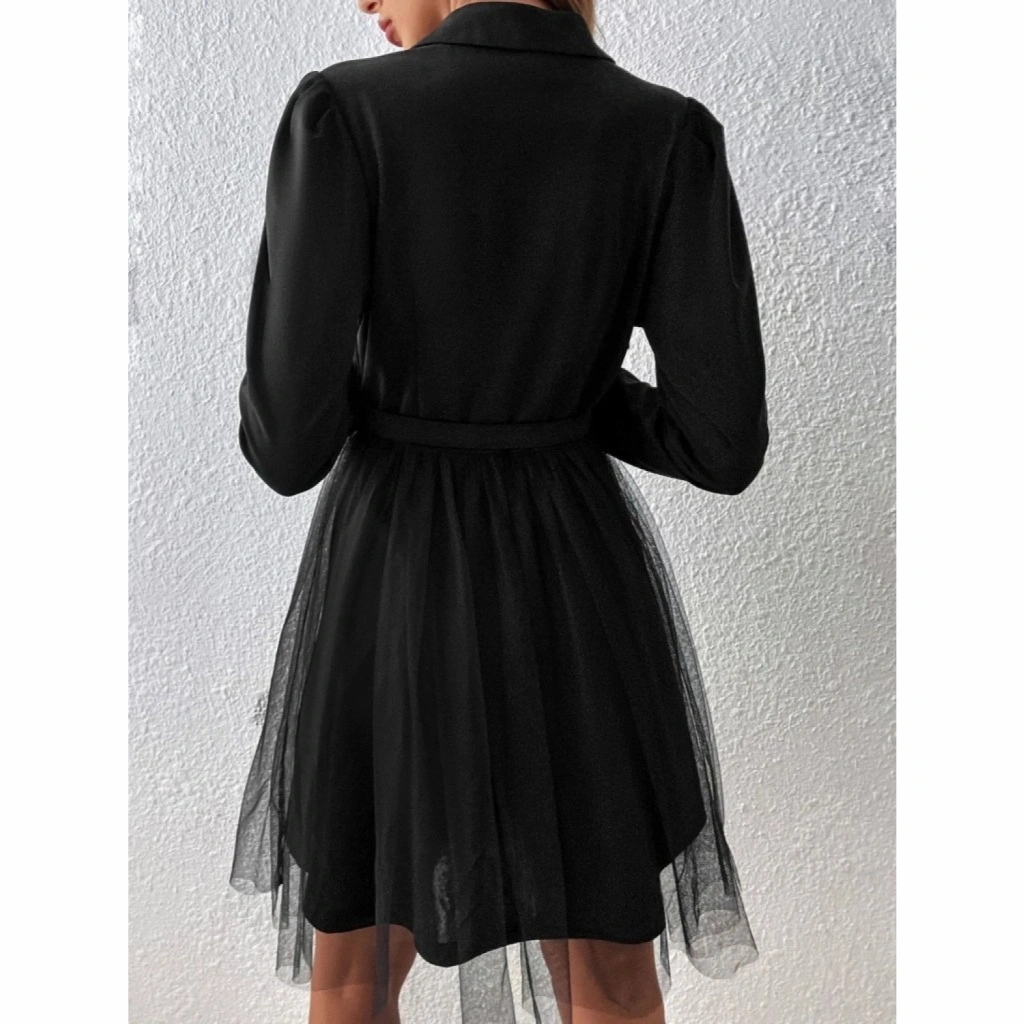 Kadın Uzun Kollu Yakalı Belinde Kemer Detaylı Mini Tüllü Ithal Krep Elbise