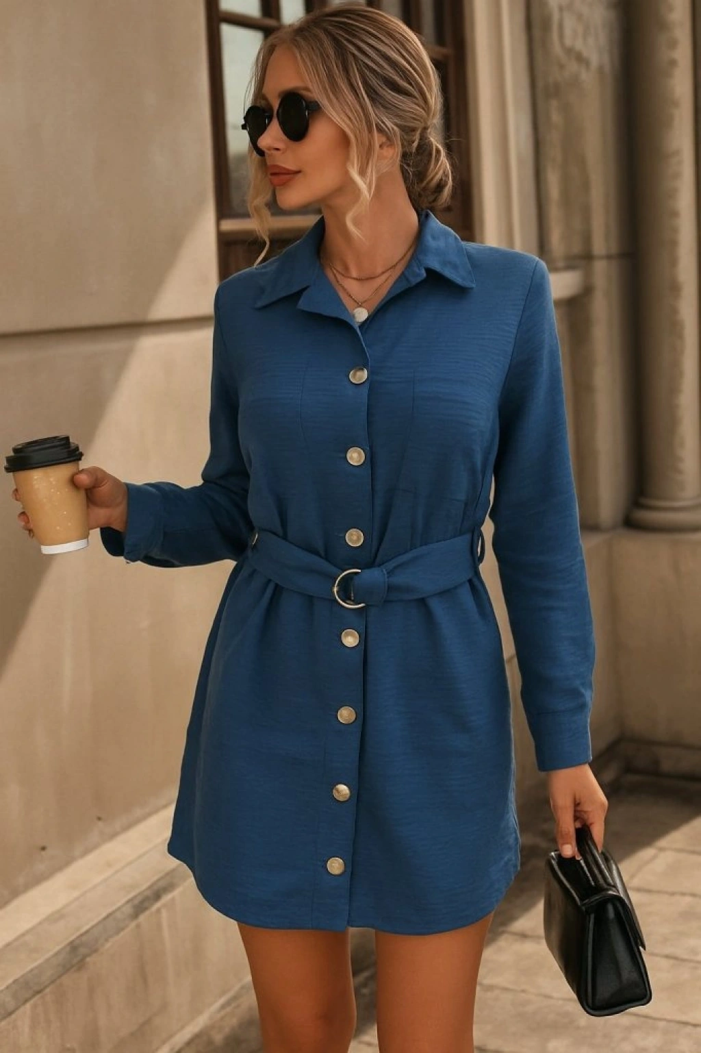 Kadın Uzun Kollu Yakalı önden Düğmeli Beli Kuşaklı Mini Ithal Keten Elbise