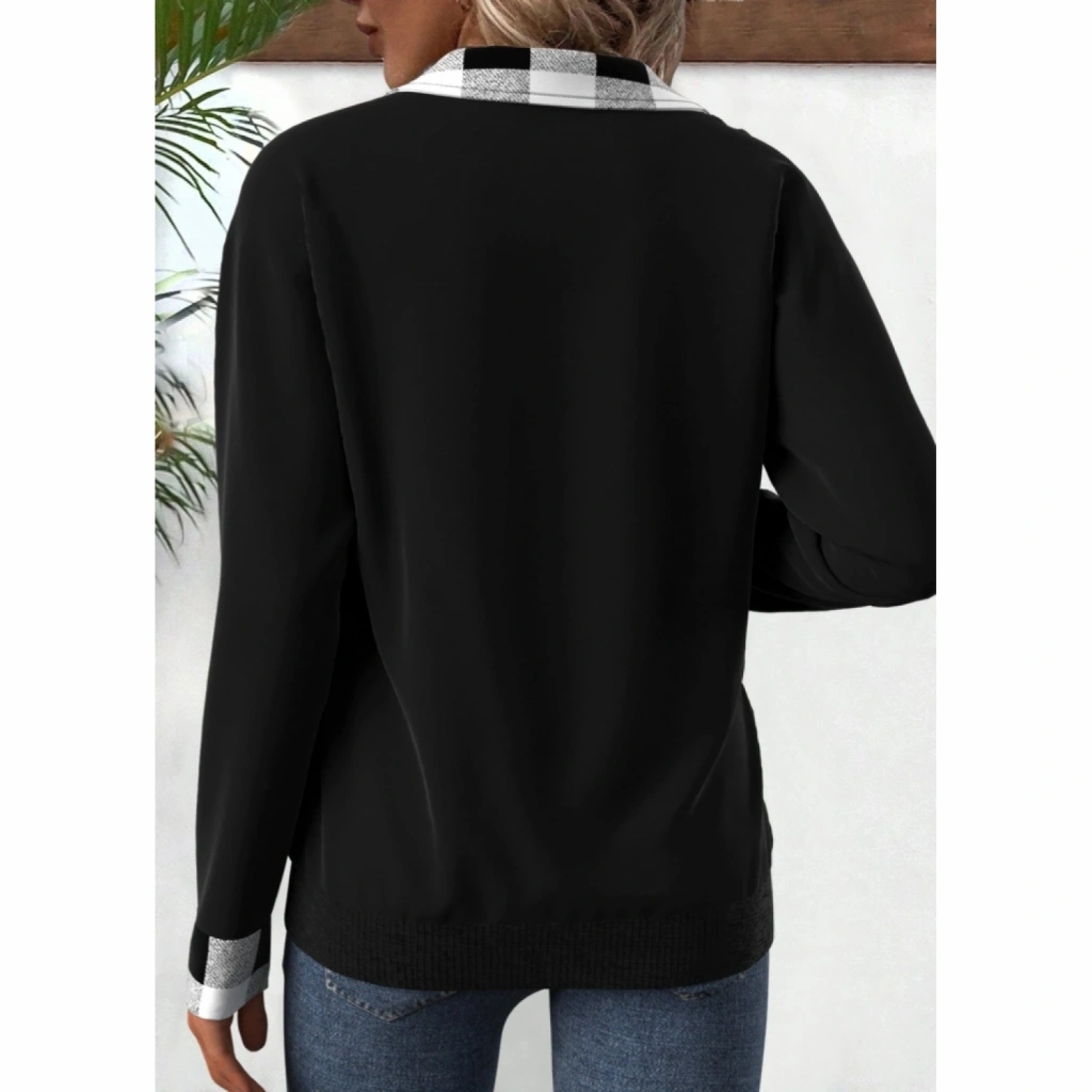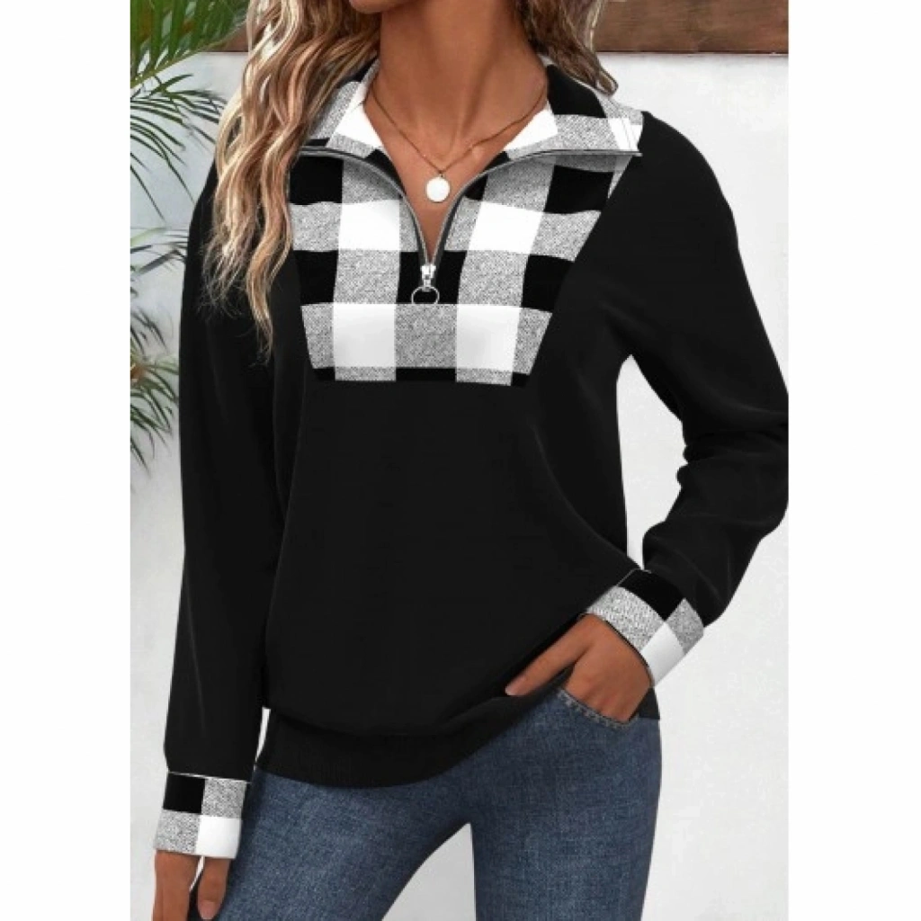 Kadın Uzun Kollu Yakalı önden Fermuarlı Ekose Detaylı Viskon Iki Iplik Bluz