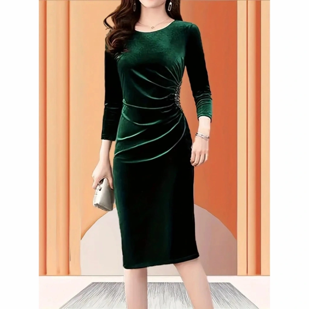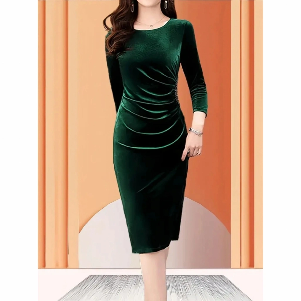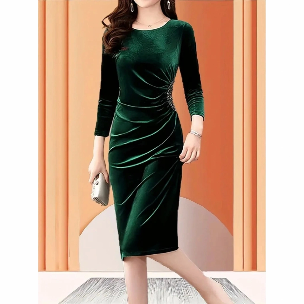 Kadın Uzun Kollu Yakası Açık Yanlardan Büzgülü Taş Detaylı Midi Kadife Elbise