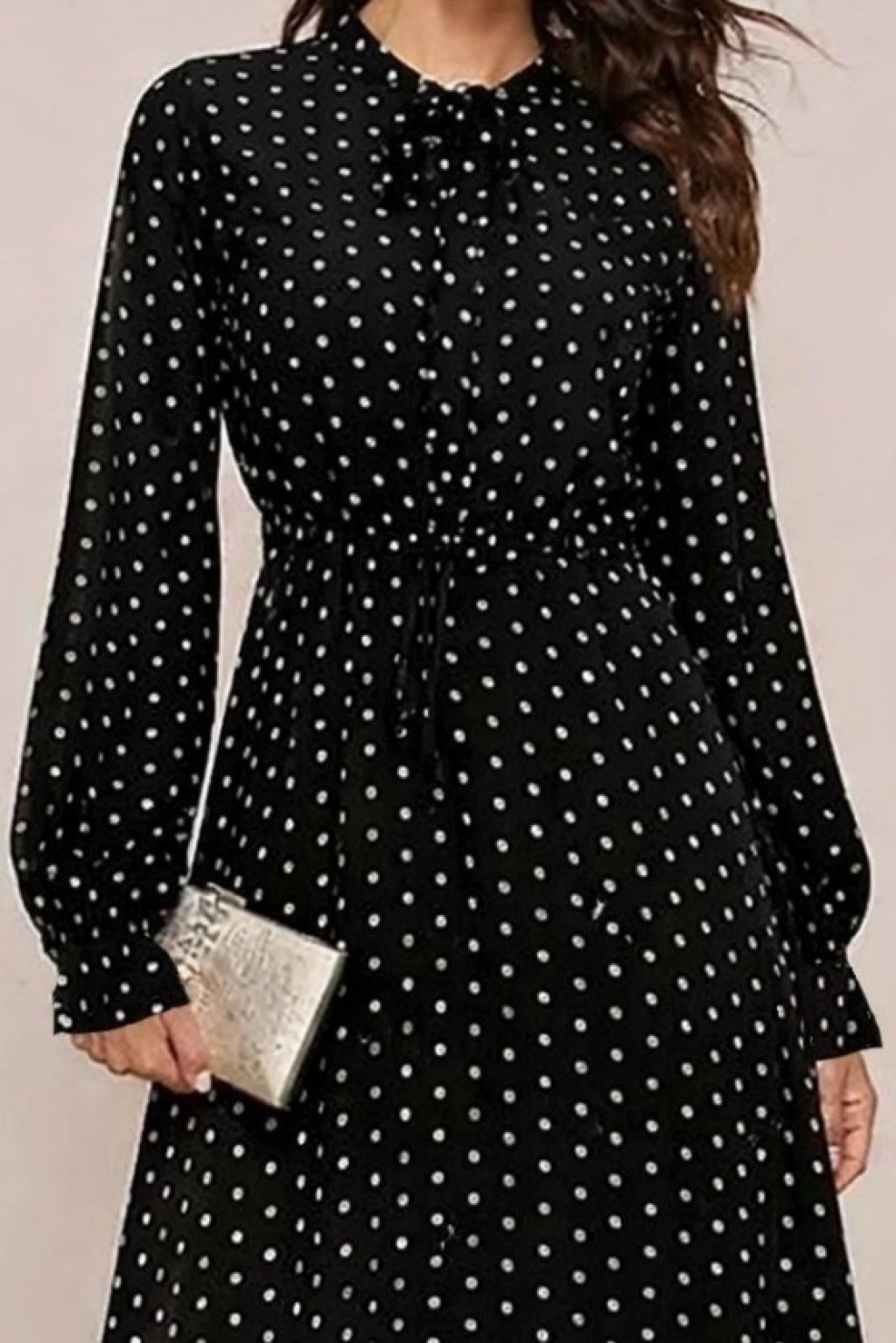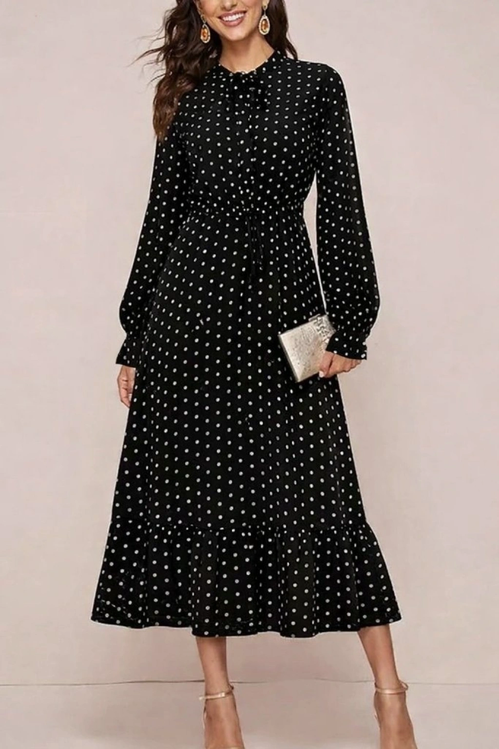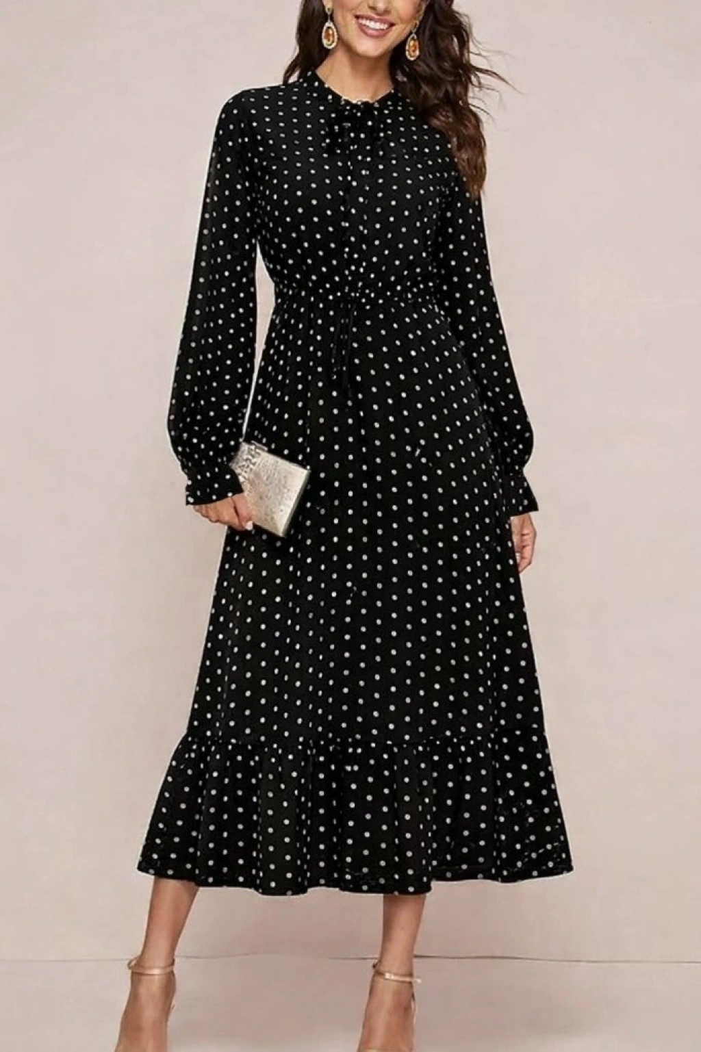 Kadın Uzun Kollu Yakası Bağcıklı Uzun Puantiyeli Krep Maxi Elbise