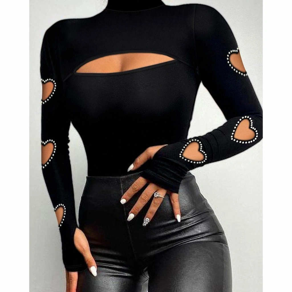 Kadın Uzun Kollu Yarı Balıkçı Yaka Pencere Detaylı Kolları Kalp Desen Taşlı Viskon Bluz
