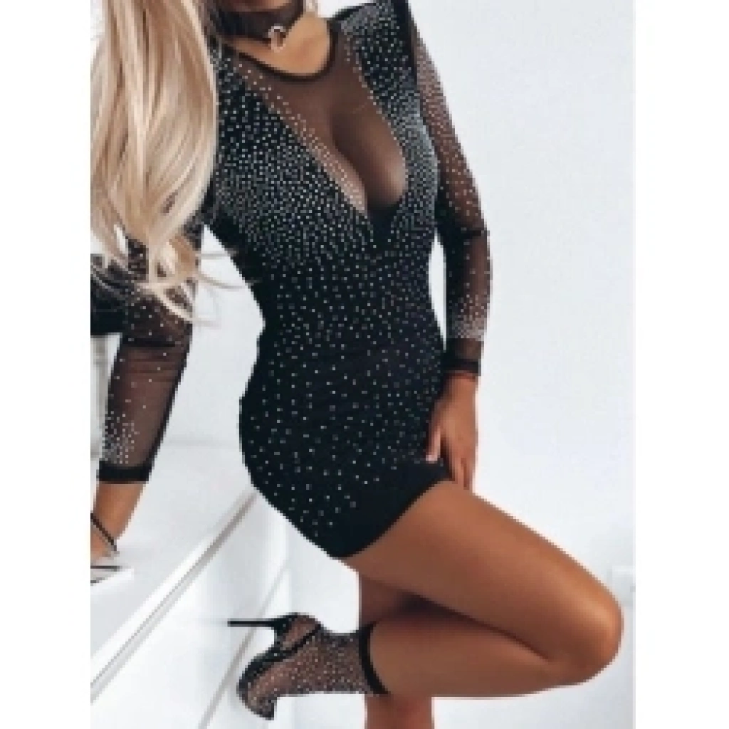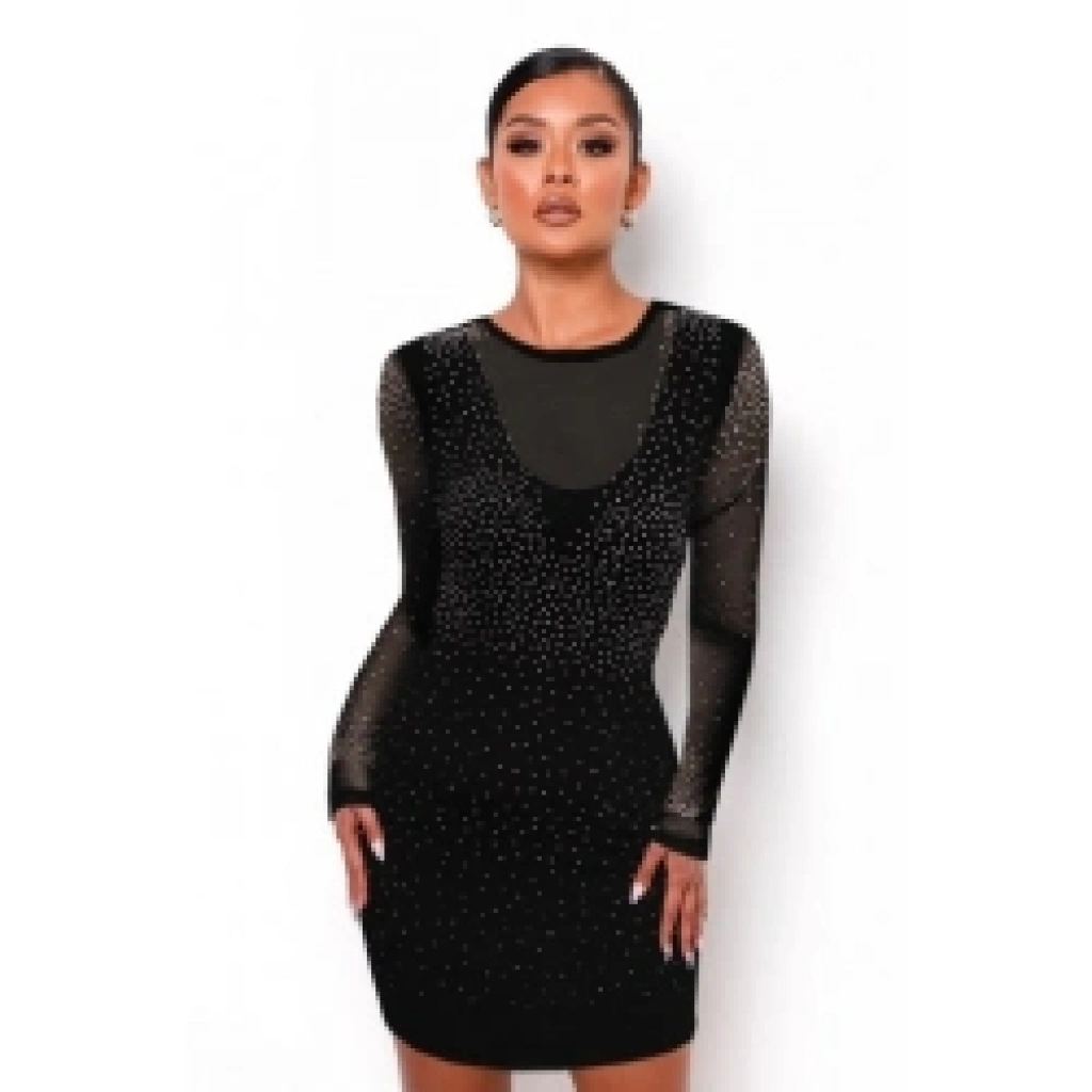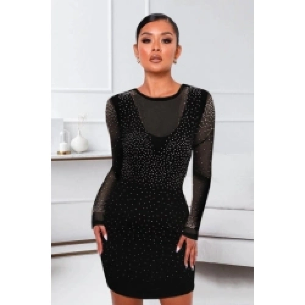Kadın Uzun Kollu Yuvarlak Yaka Dekolteli Taşlı Dalgıç Elbise