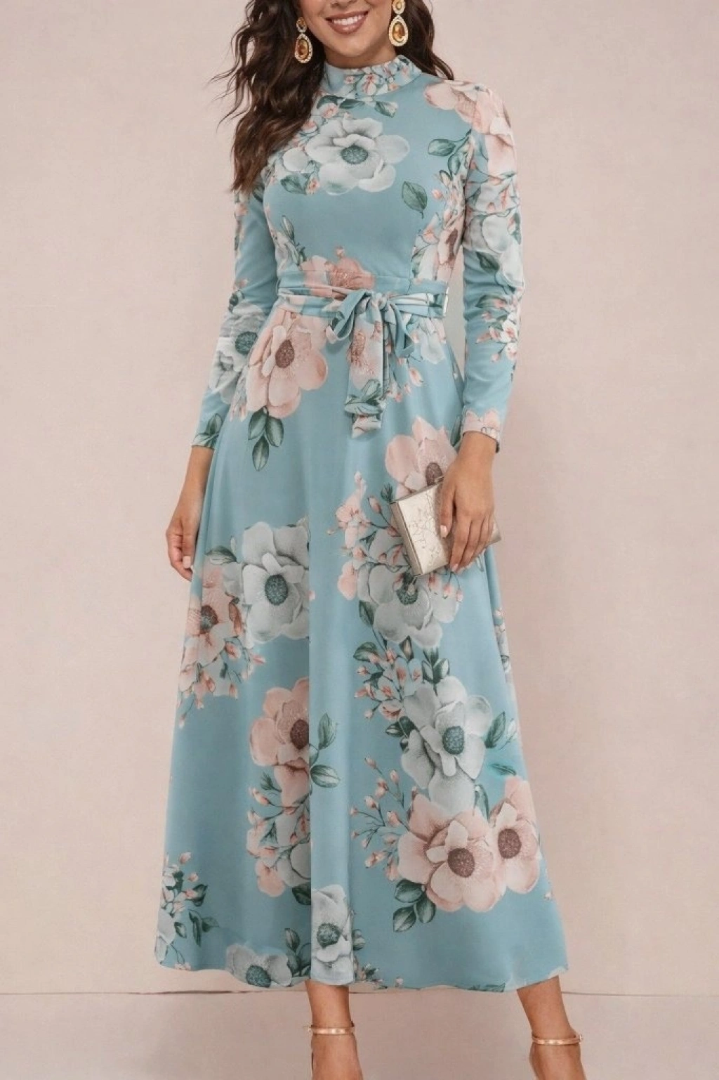 Kadın Uzun Kollu Yuvarlak Yakalı Beli Kuşaklı Desenli Süprem Uzun Elbise