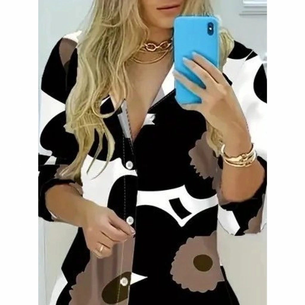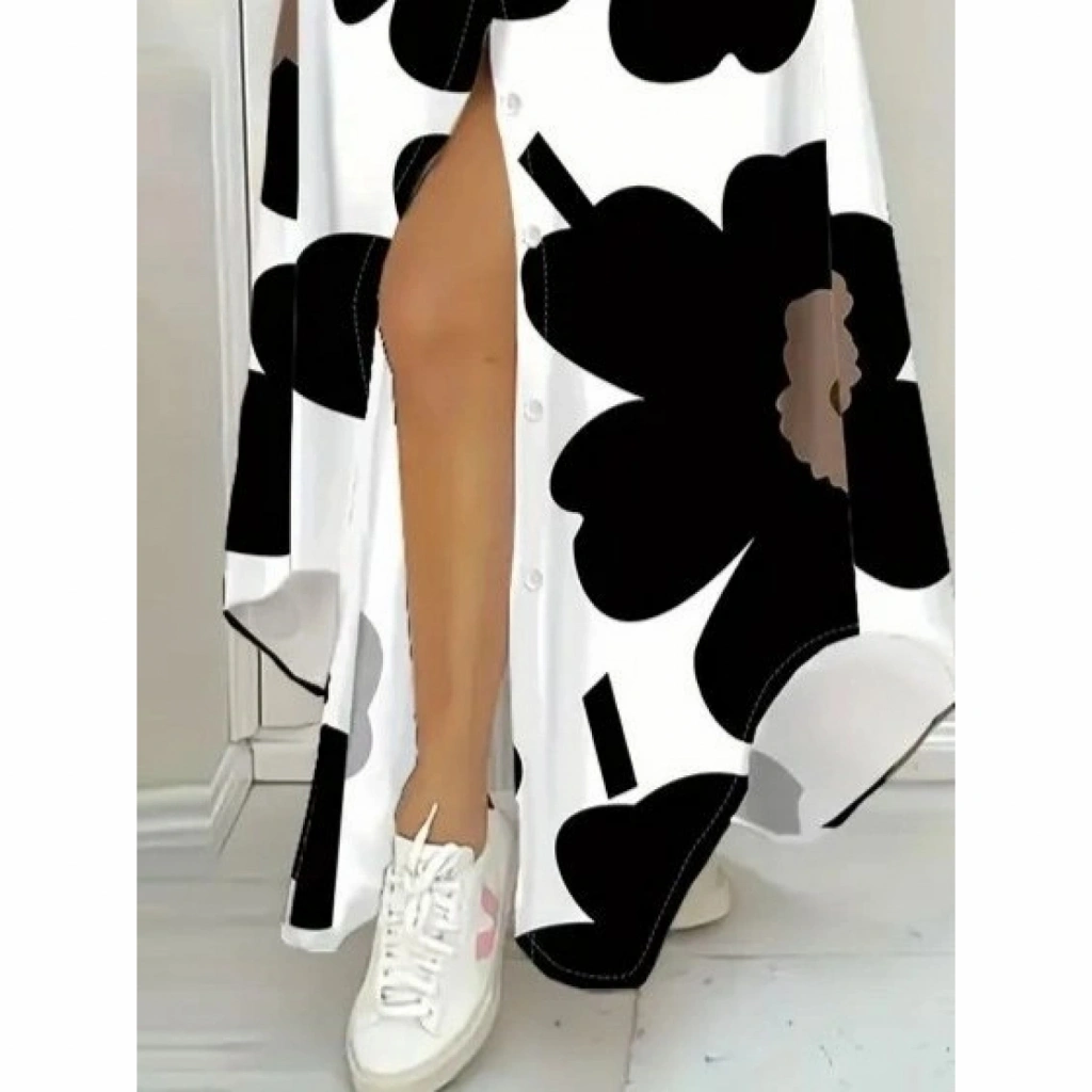 Kadın Yakalı önden Düğmeli çiçek Desenli Uzun Süprem Elbise