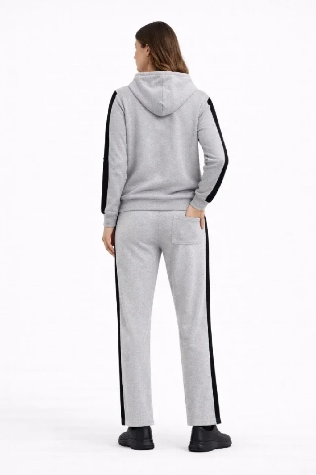 KADIN Yandan Şeritli Eşofman Takım Kapüşonlu Sweatshirt Boru Paça Alt, Oversize 3 Iplik Pamuklu - Gri