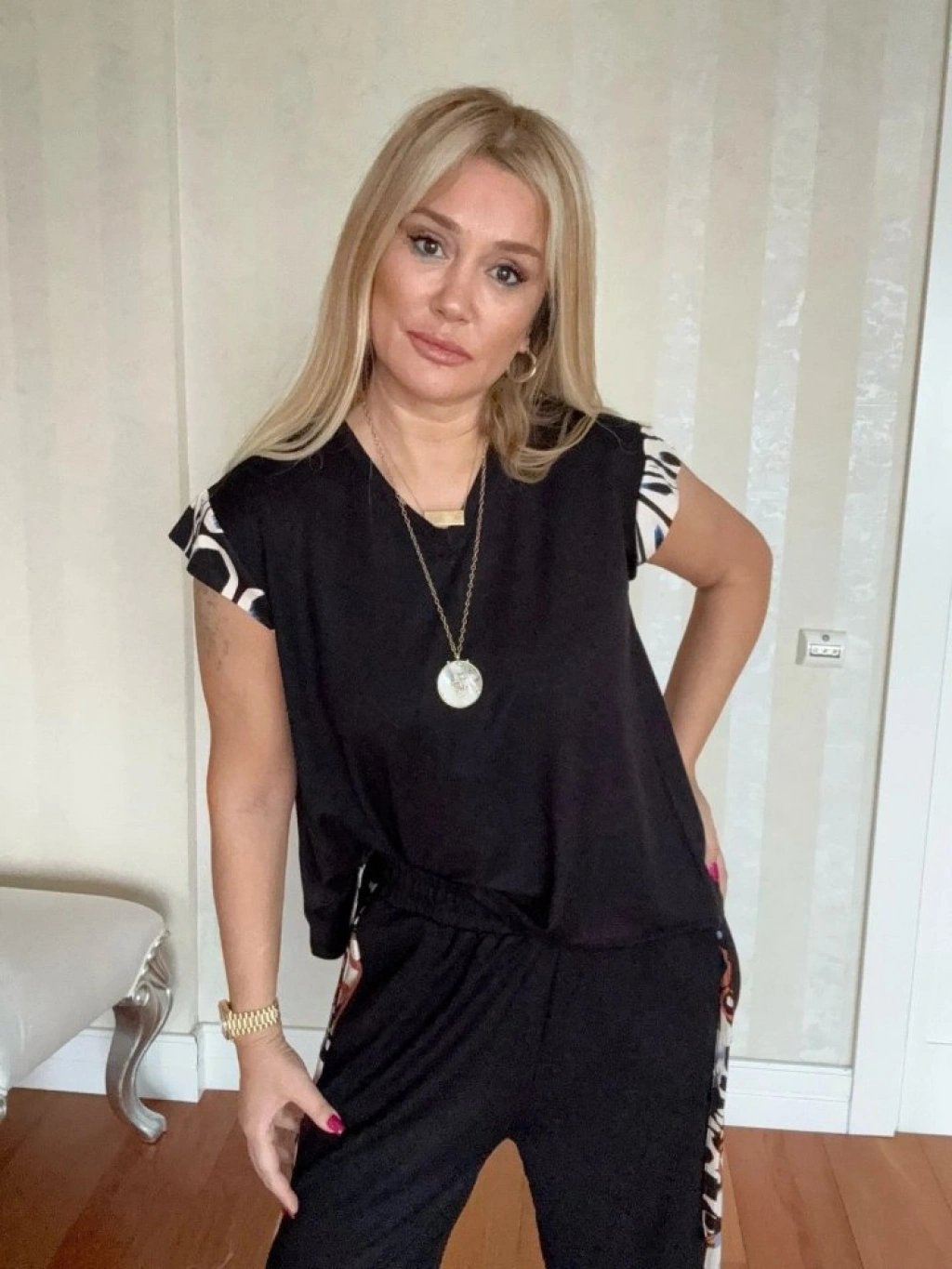 Kadın Yarasa Kol Dijital Baskı Detay Bluz Ve Yanı şerit Detay Kristal Kumaş Pantolon Ikili Takım