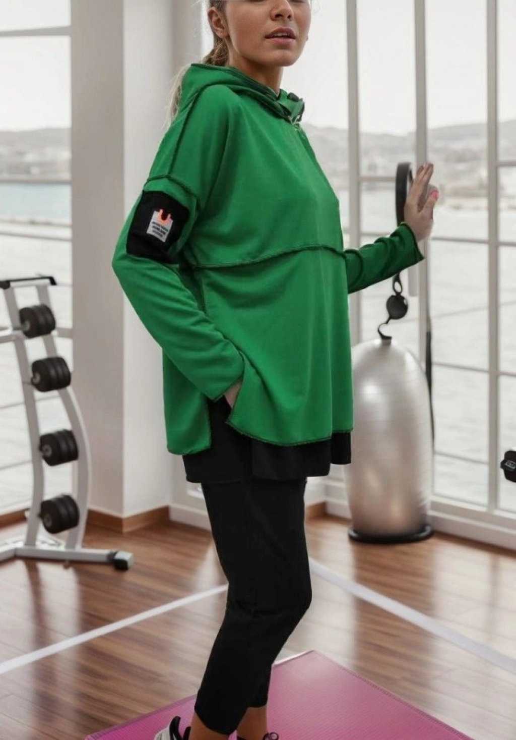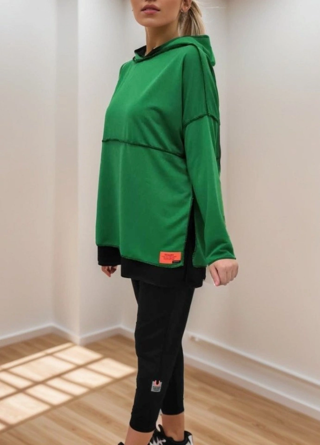 Kadın Yeşil Kapşonlu Etek Ucu Detay Arma Ters Dikiş Gorunumlu Ikili Takım