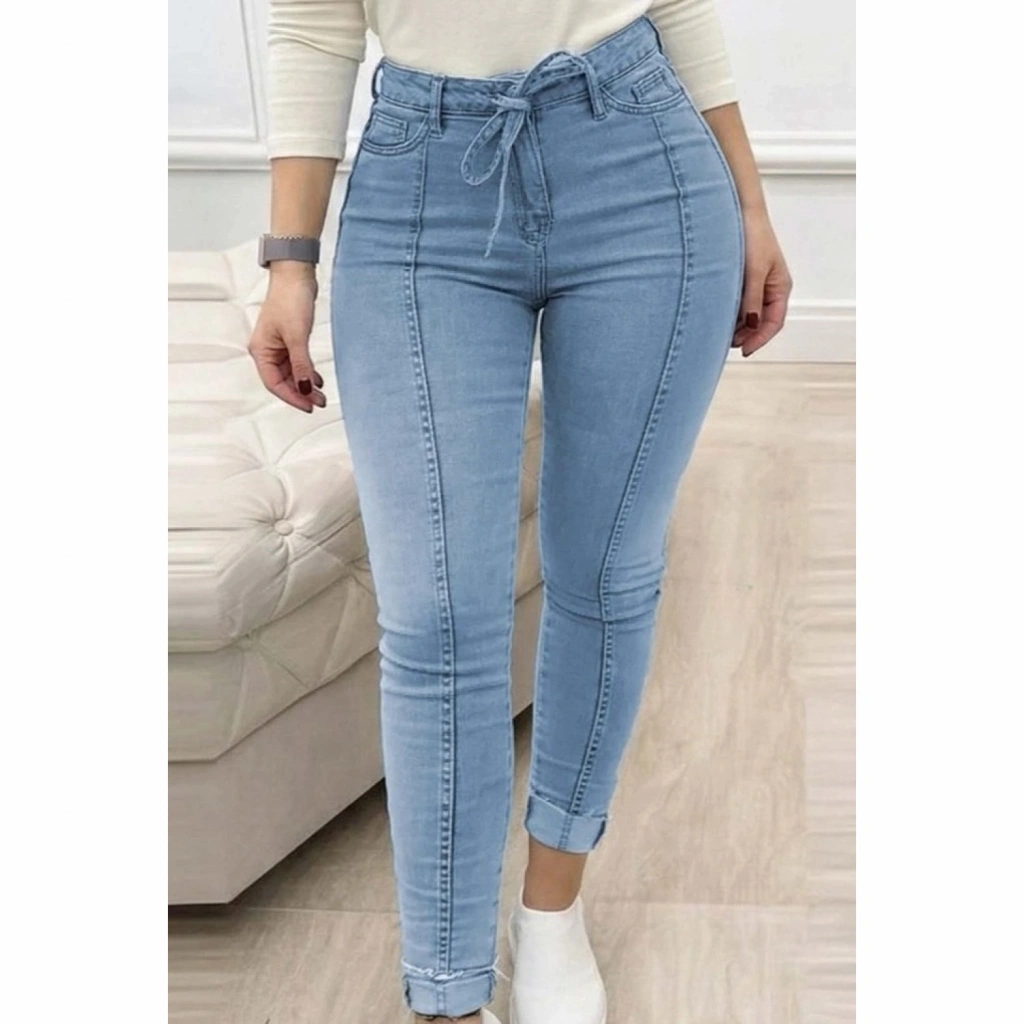 Kadın Yüksek Bel Belden Kuşaklı Yırtık Detaylı Kot Pantolon
