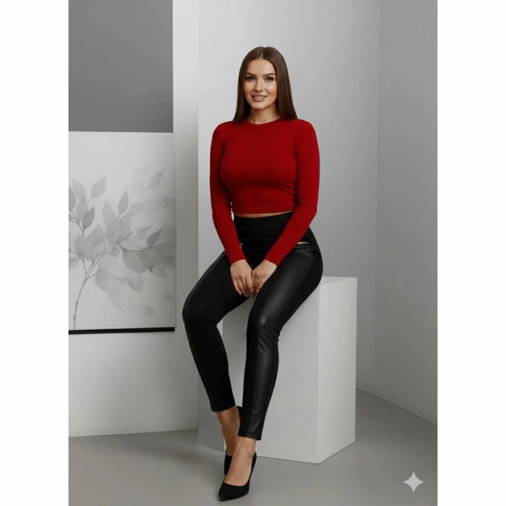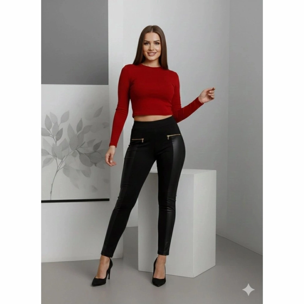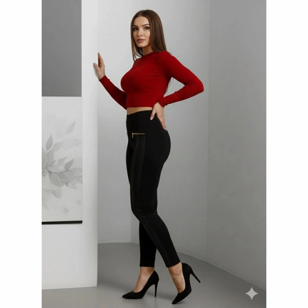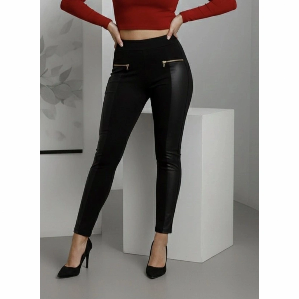 Kadın Yüksek Bel Deri Detaylı Fermuarlı Dalgıç Tayt