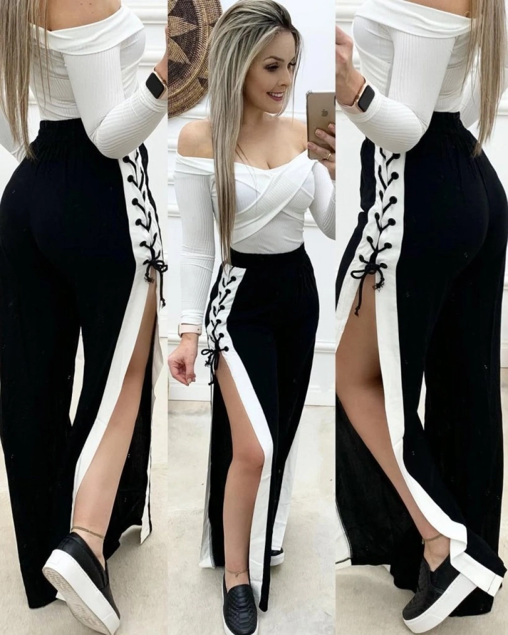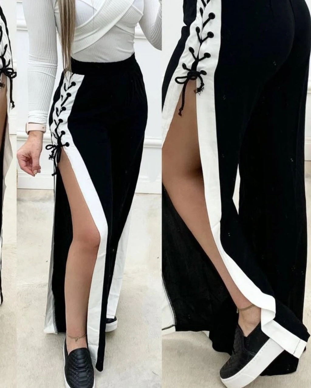 Kadın Yüksek Bel Yandan çapraz Bağcıklı Yırtmaçlı Viskon Iki Iplik Pantolon