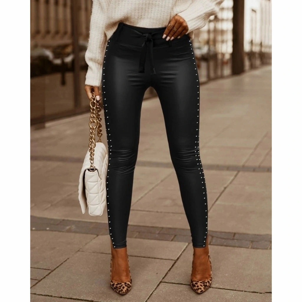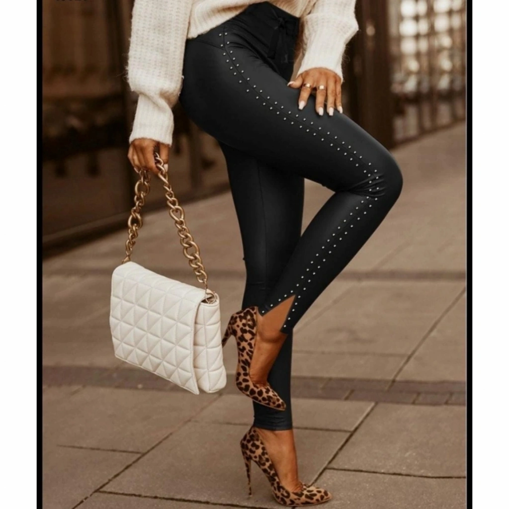 Kadın Yüksek Bel Yanlardan Incili Yırtmaçlı Uzun Deri Tayt