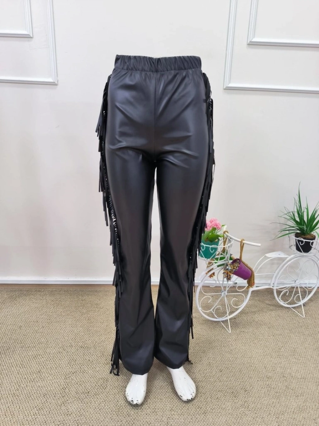 Kadın Yüksek Bel Yanlardan Püsküllü Deri Pantolon