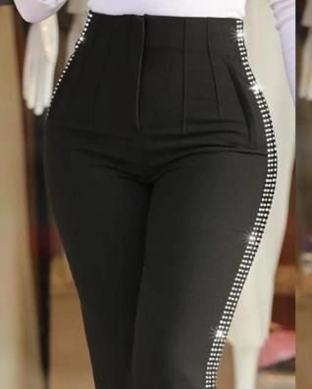 Kadın Yüksek Bel Yanlardan Taş Detaylı Ithal Krep Pantolon