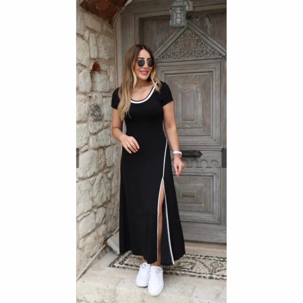 Kadın Yuvarlak Ribana Yaka Beyaz Yırtmaç Detaylı Viskon Tam Boy Elbise