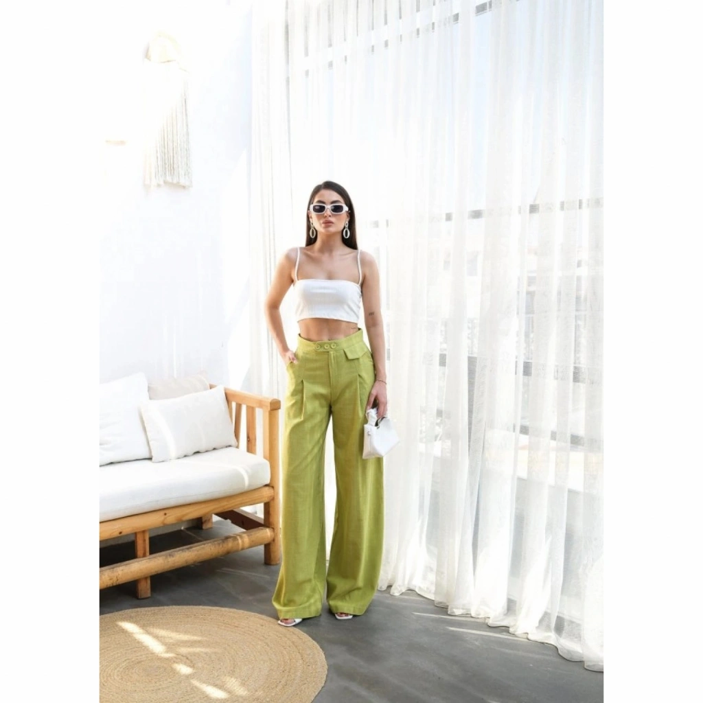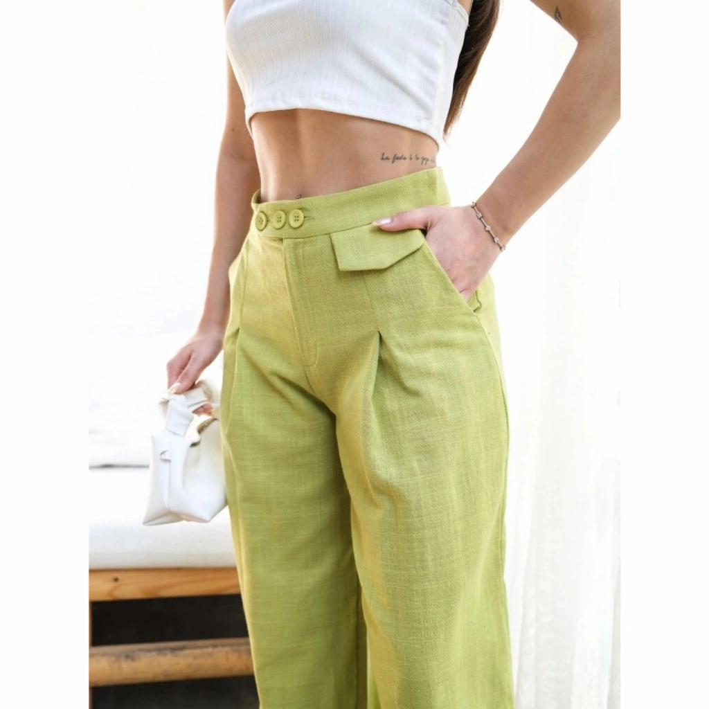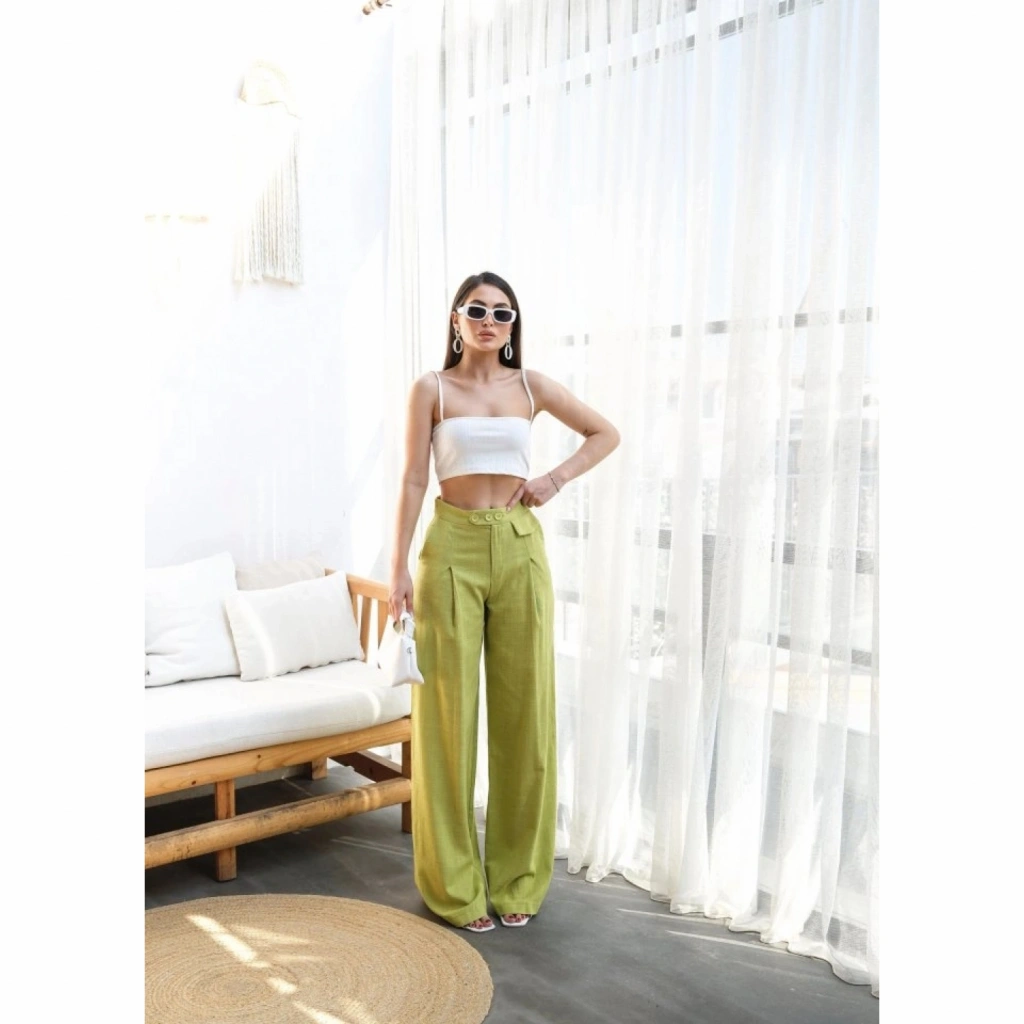 Keten Düğme Detayli Dökümlü Palazzo Pantolon