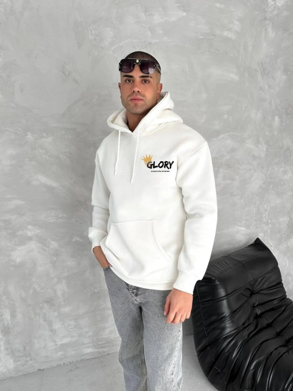 Erkek Baskılı Üç İplik Kapüşonlu Oversize Sweatshirt - Beyaz