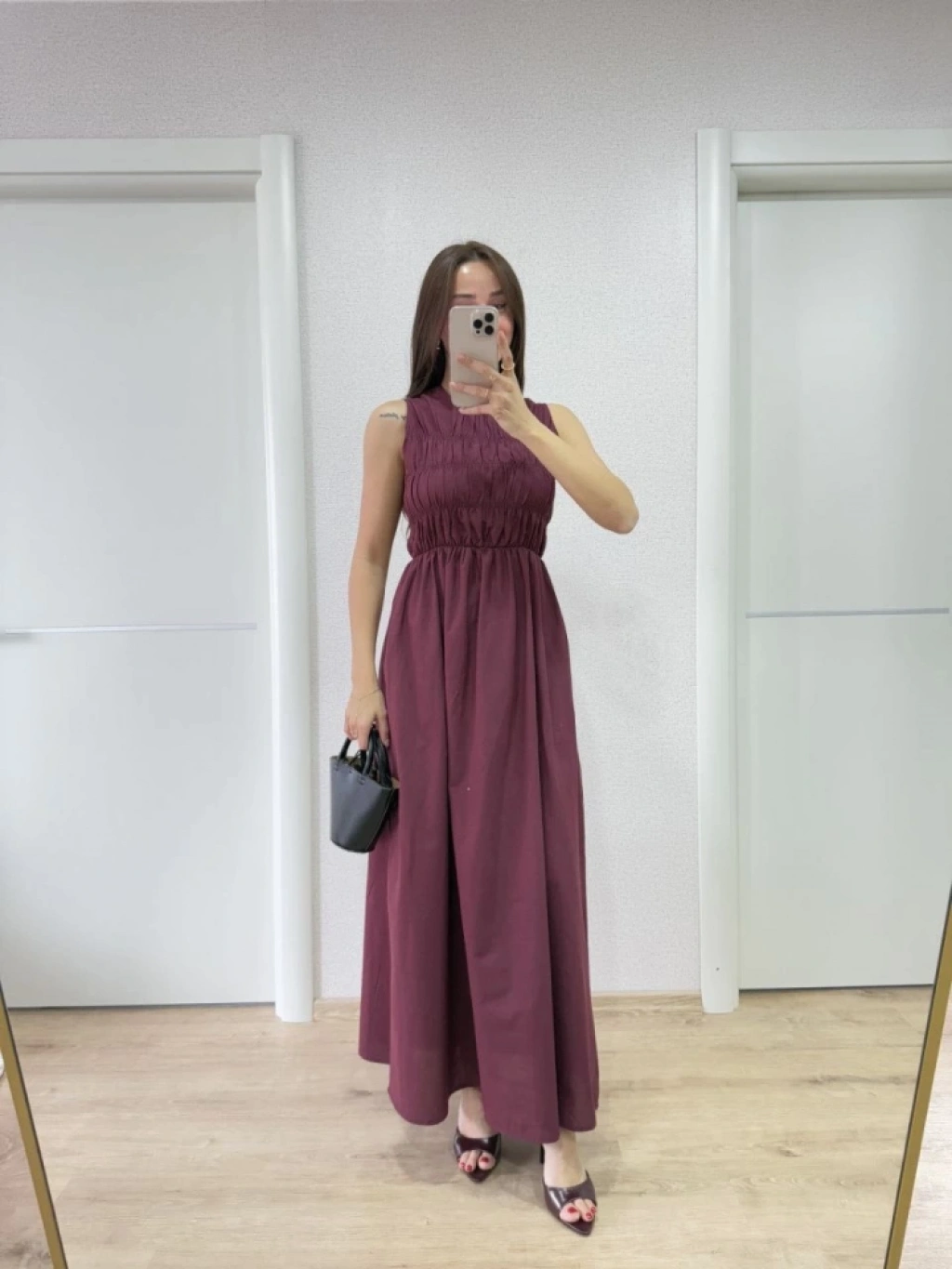 Kolsuz Göğüs Lastıklı Uzun Elbise - Bordo
