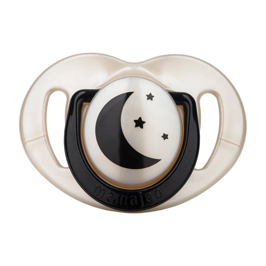 Mamajoo Sterilizasyon & Saklama Kutulu İkili Desenli Ortodontik Black & Pearl / Gece & Gündüz Emzikleri, hem gece hem de gündüz kullanım için uygundur ve karanlıkta bir süre parlayan emzik gövdesi sayesinde gece kolaylıkla emziğin bulunmasını sağlar.