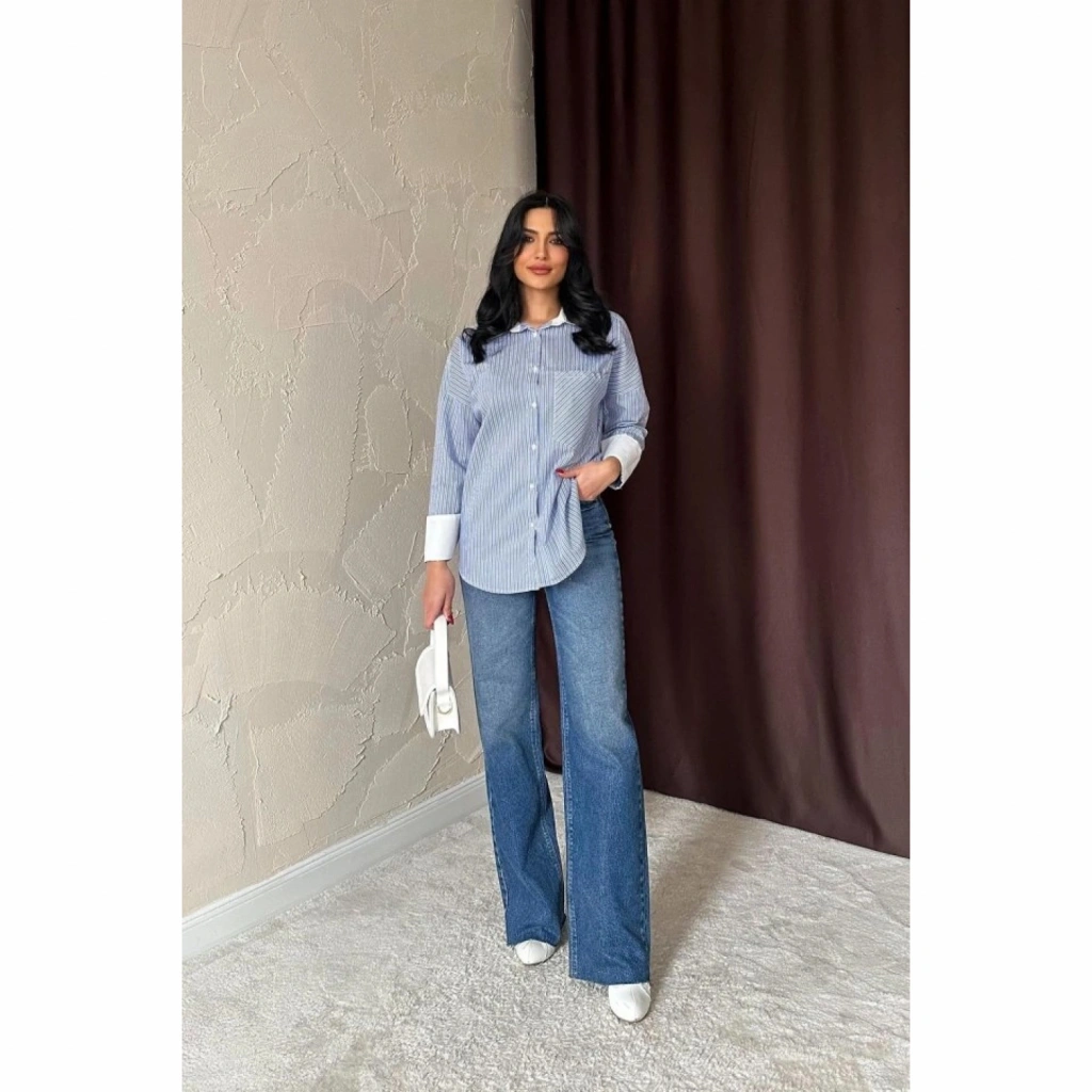 Mavi Çizgili Poplin Uzun Kol Gömlek