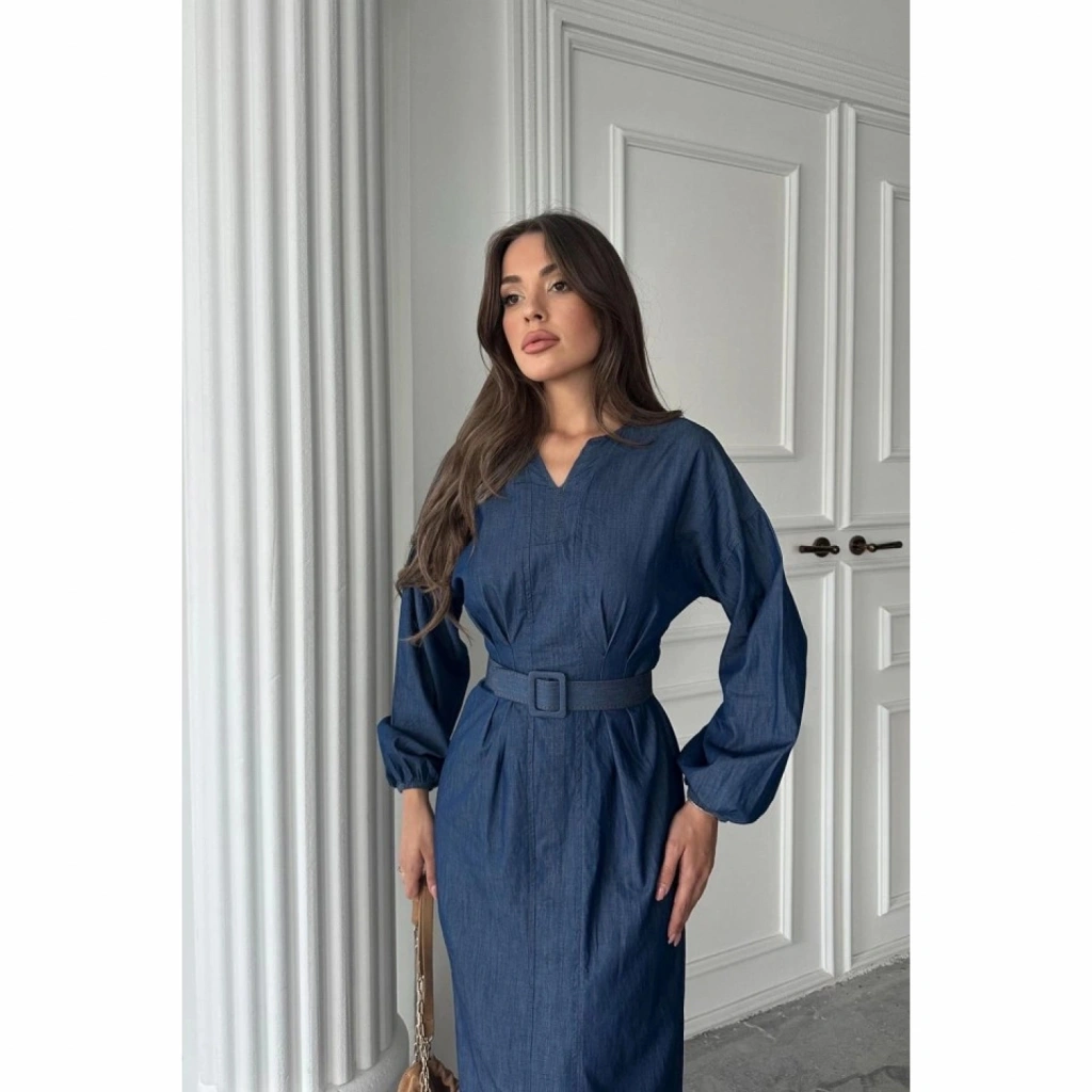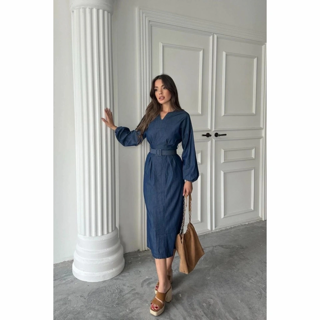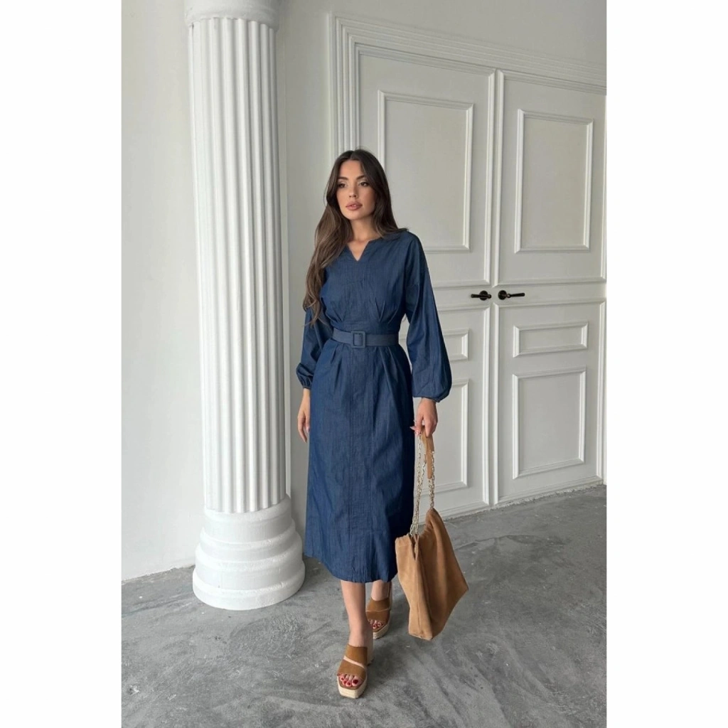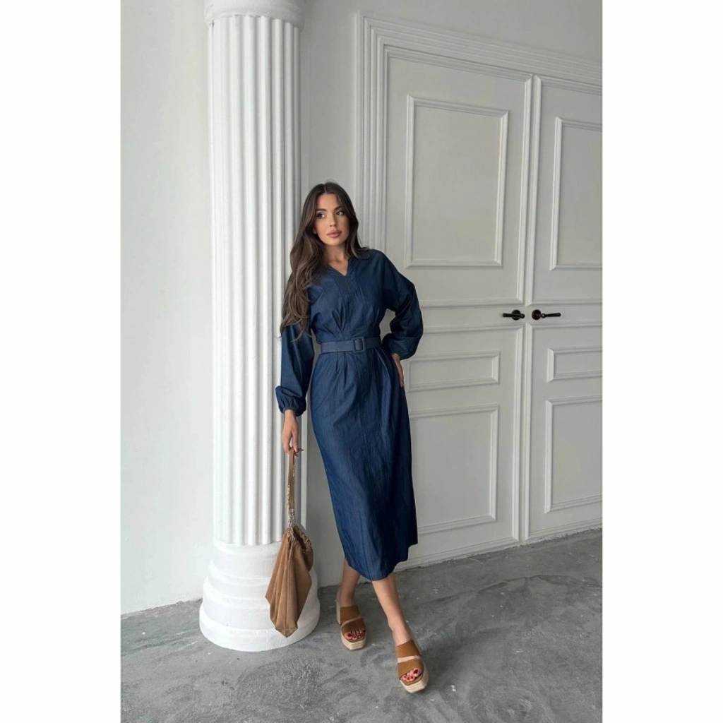 Mavi Tencel Uzun Kollu Elbise