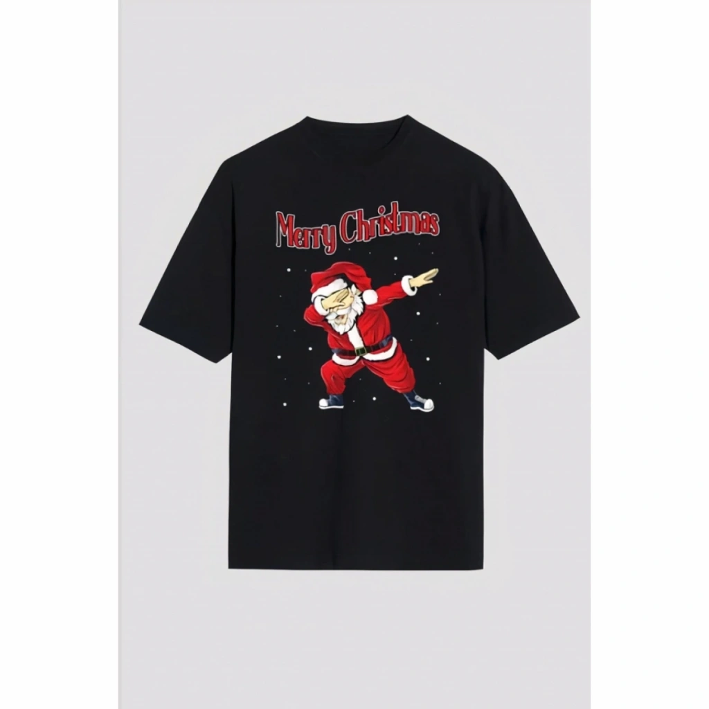 Merry Christmas Baskılı Noel Babalı T-shirt - Siyah