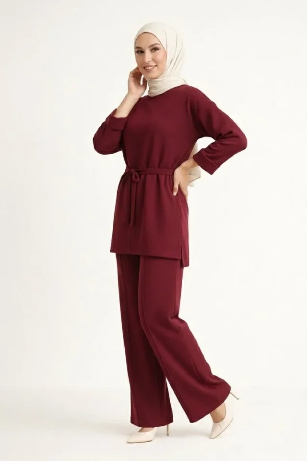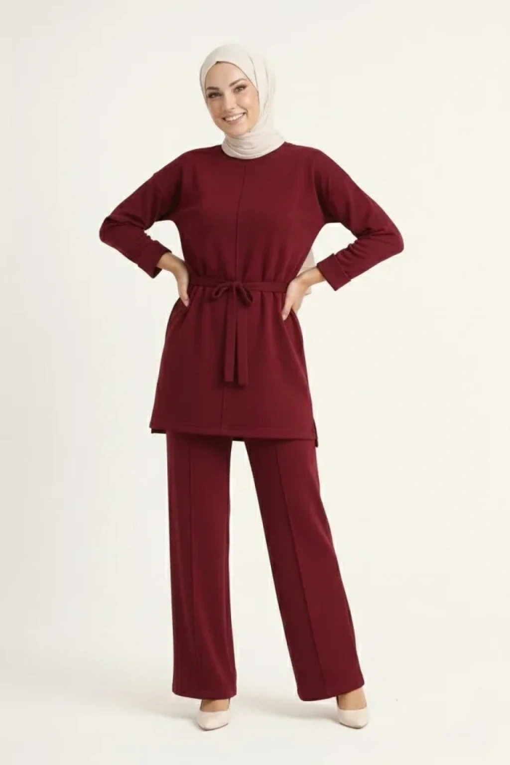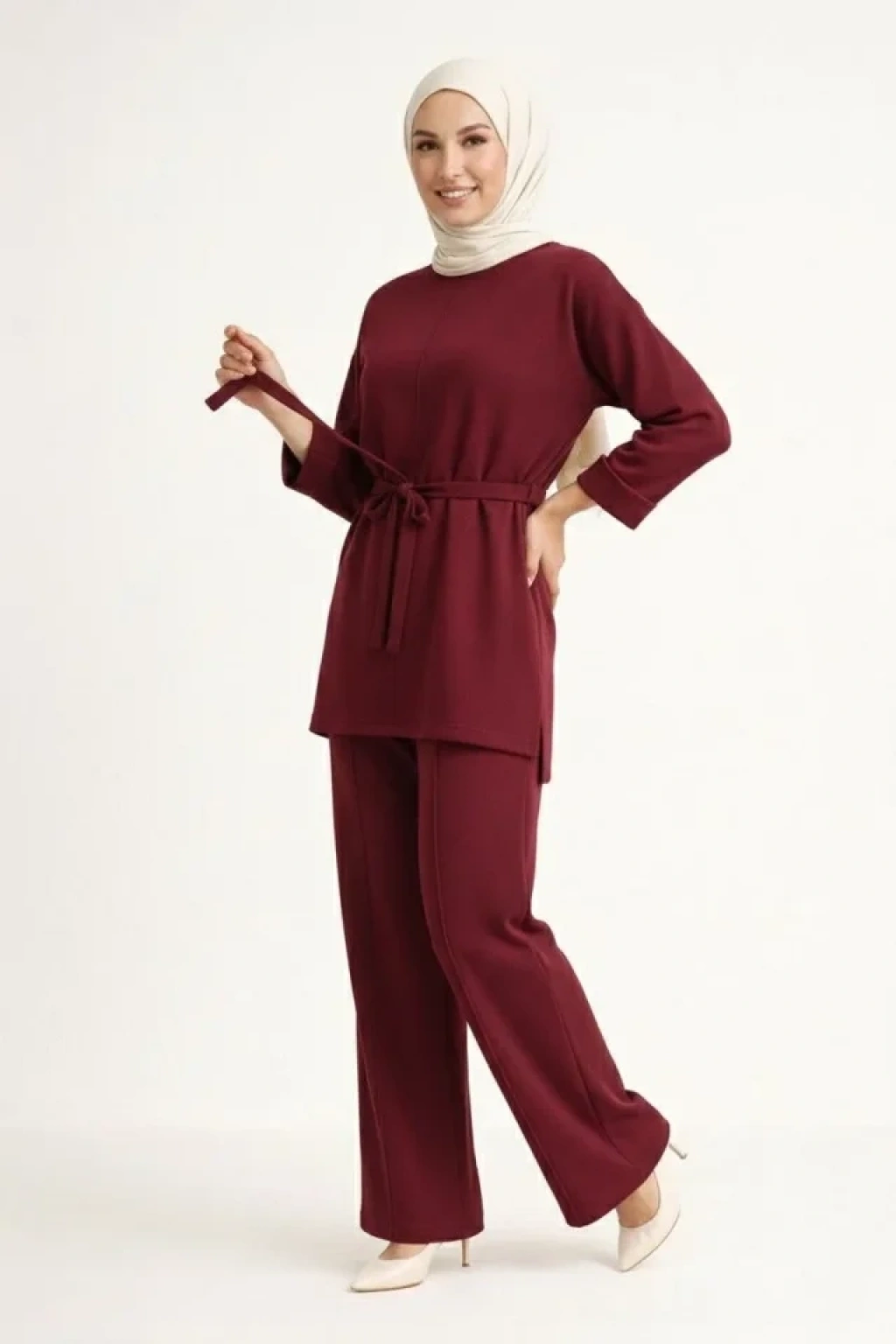Osy Modal Yumuşak Dokulu Kuşaklı Tesettür Takım Salaş Kalıp 4/3 Kol Katlanmış Kol İkili Takım - Bordo