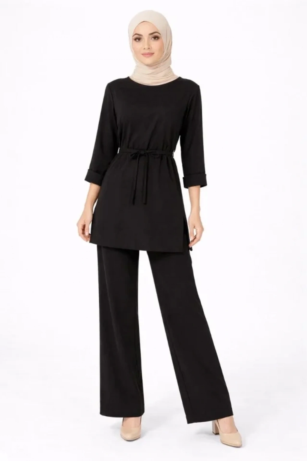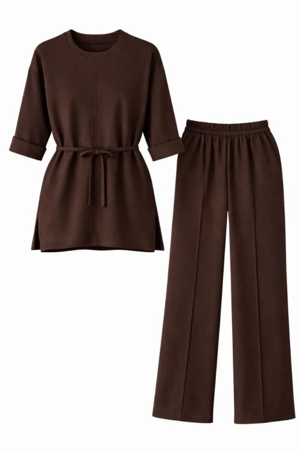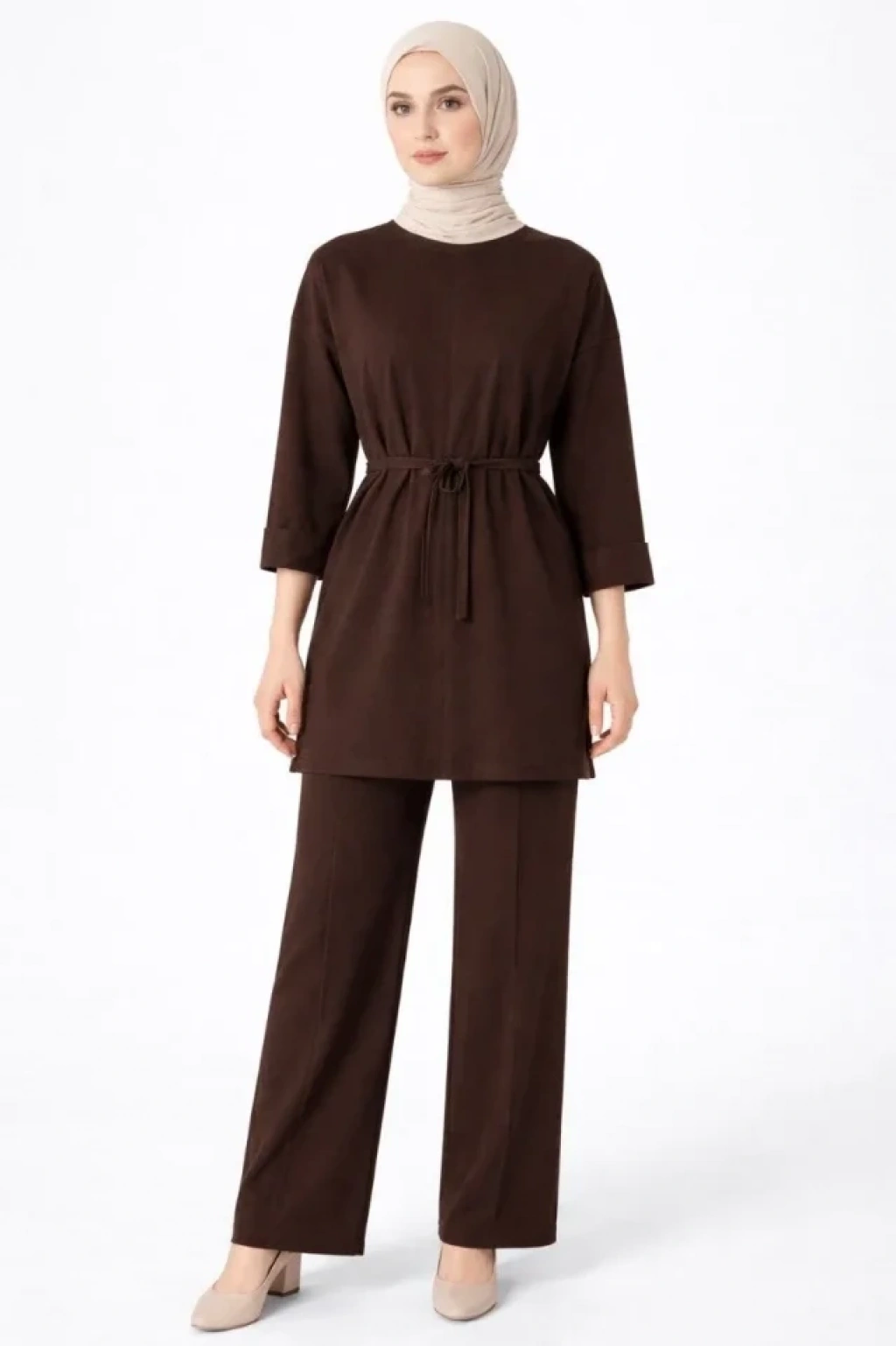 Osy Modal Yumuşak Dokulu Kuşaklı Tesettür Takım Salaş Kalıp 4/3 Kol Katlanmış Kol İkili Takım - Kahverengi