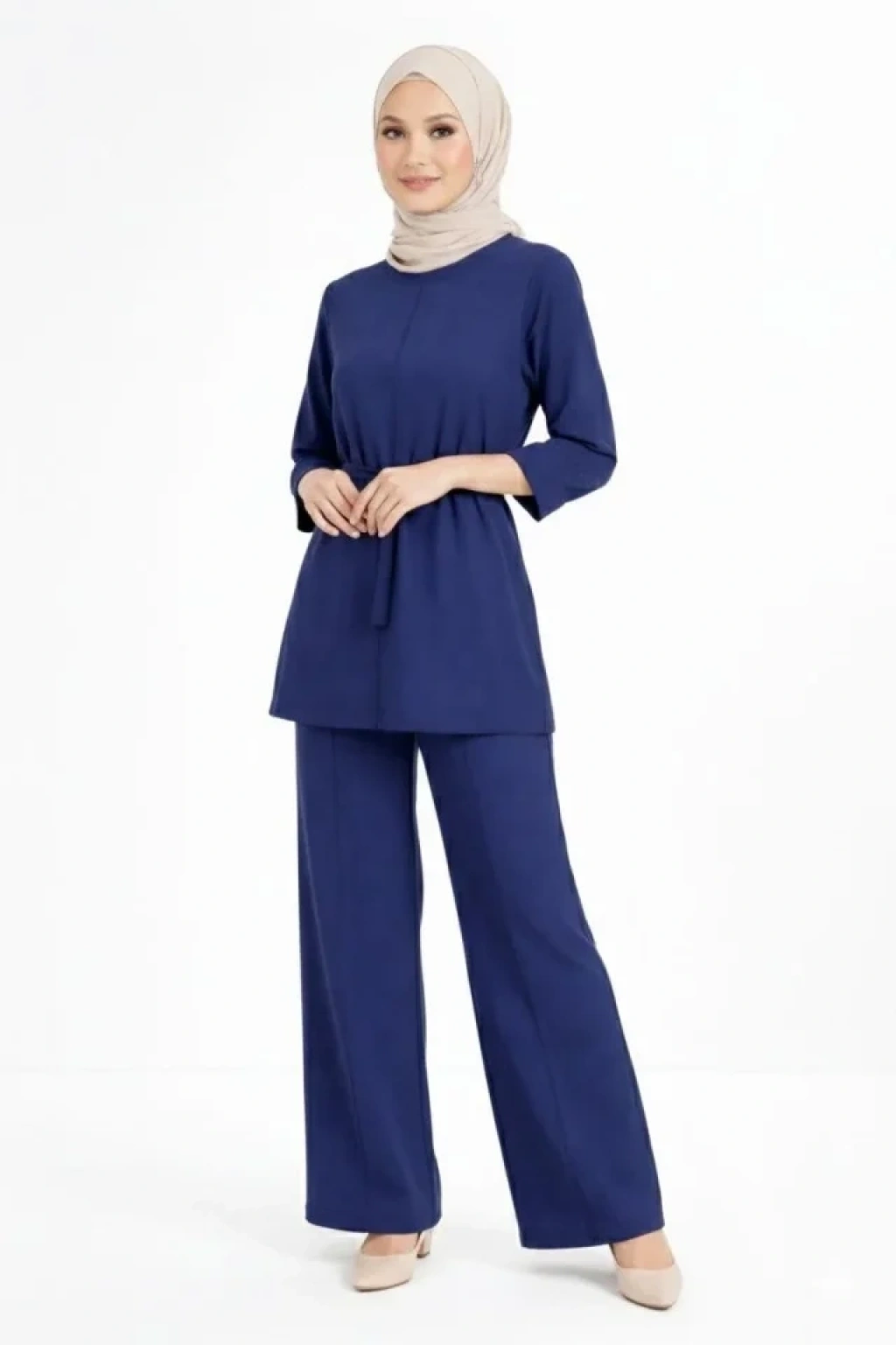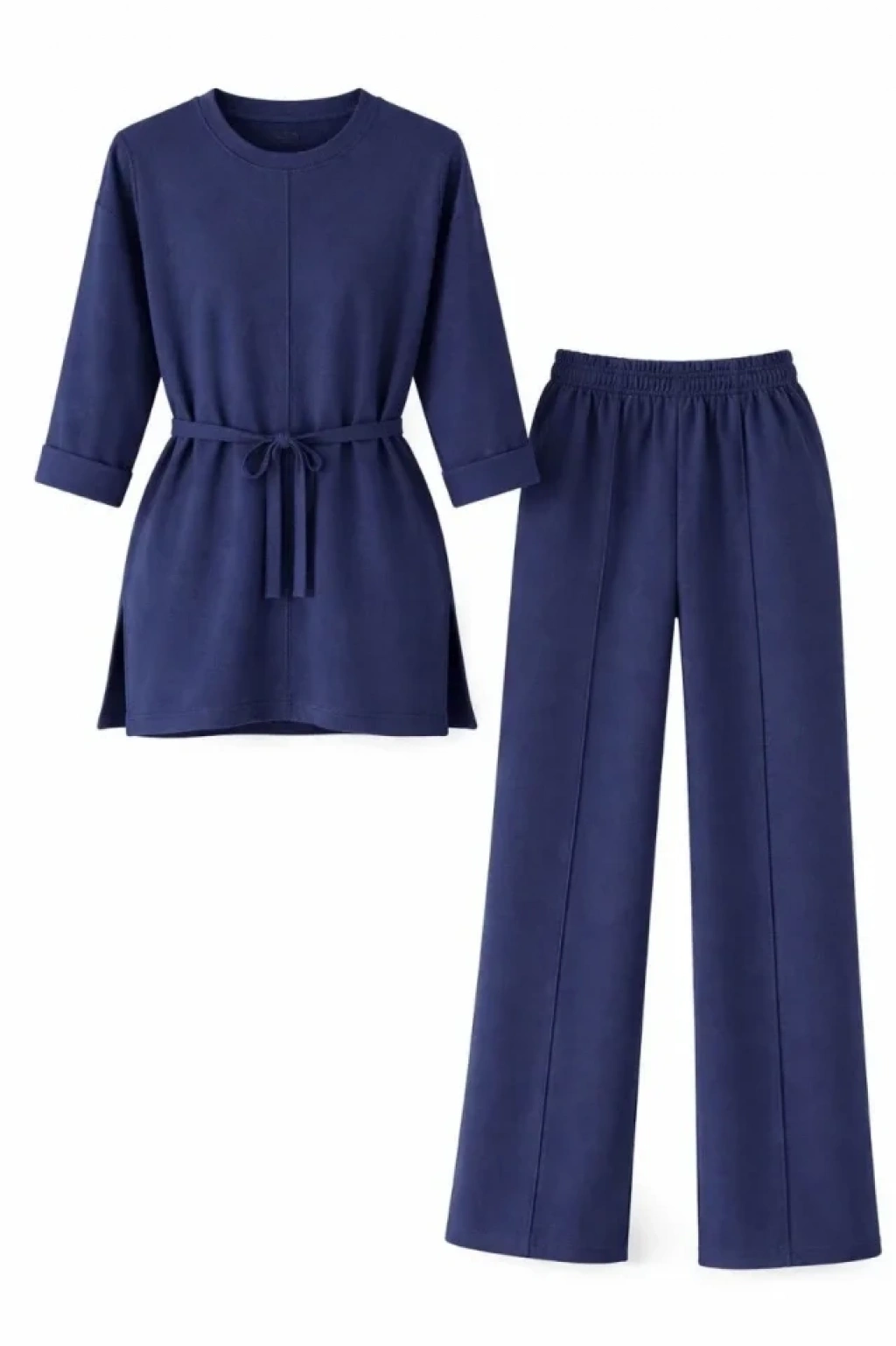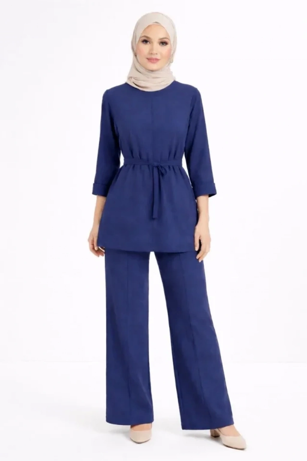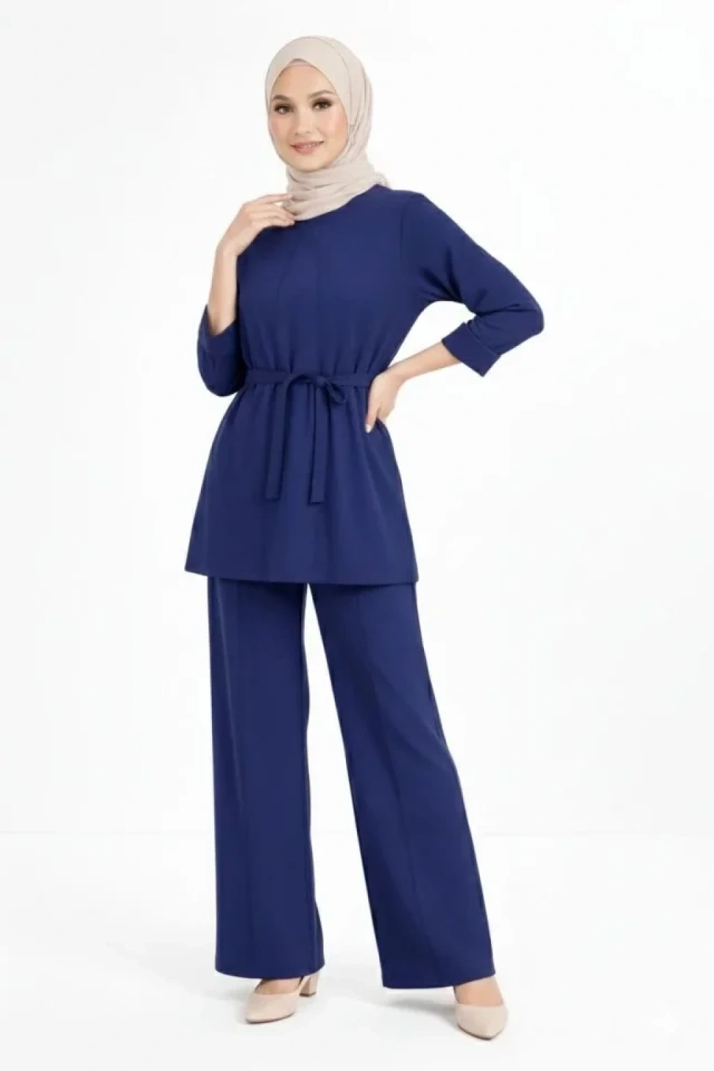 Osy Modal Yumuşak Dokulu Kuşaklı Tesettür Takım Salaş Kalıp 4/3 Kol Katlanmış Kol İkili Takım - Lacivert