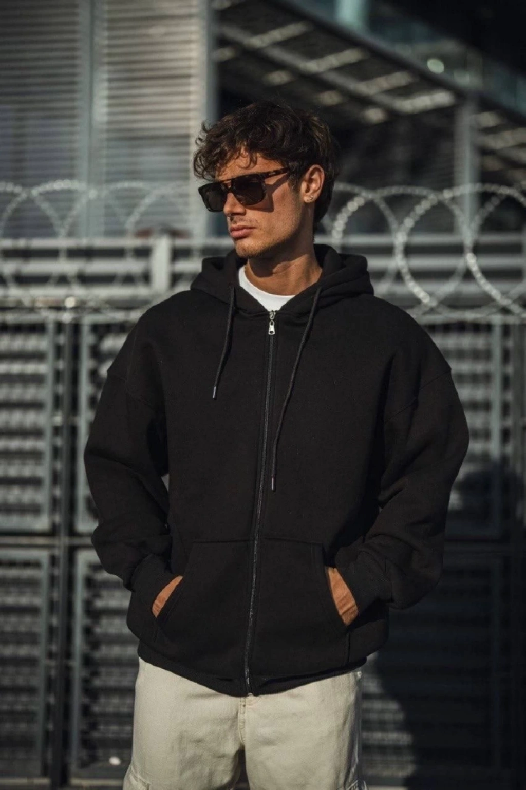Erkek Kapüşonlu Düz Fermuarlı Hırka - Siyah