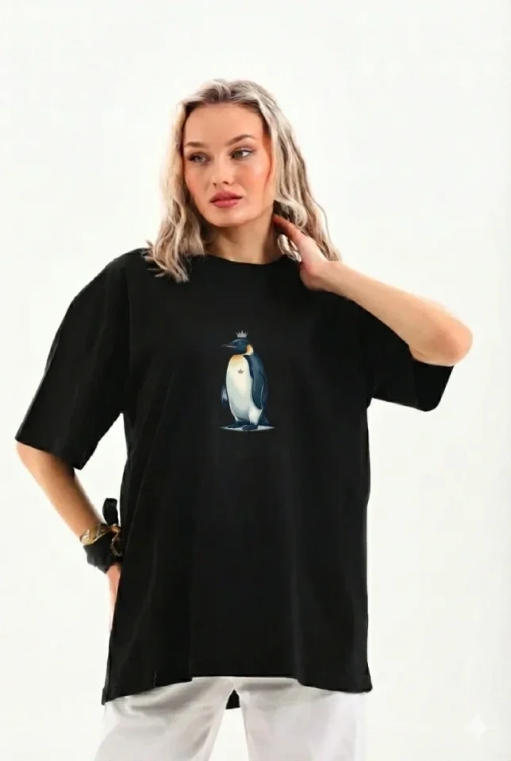 Oversize Tişört - Sırt Baskılı Survivor Penguin Temalı, Felsefi Yazılı Bisiklet Yaka Tişört - Siyah