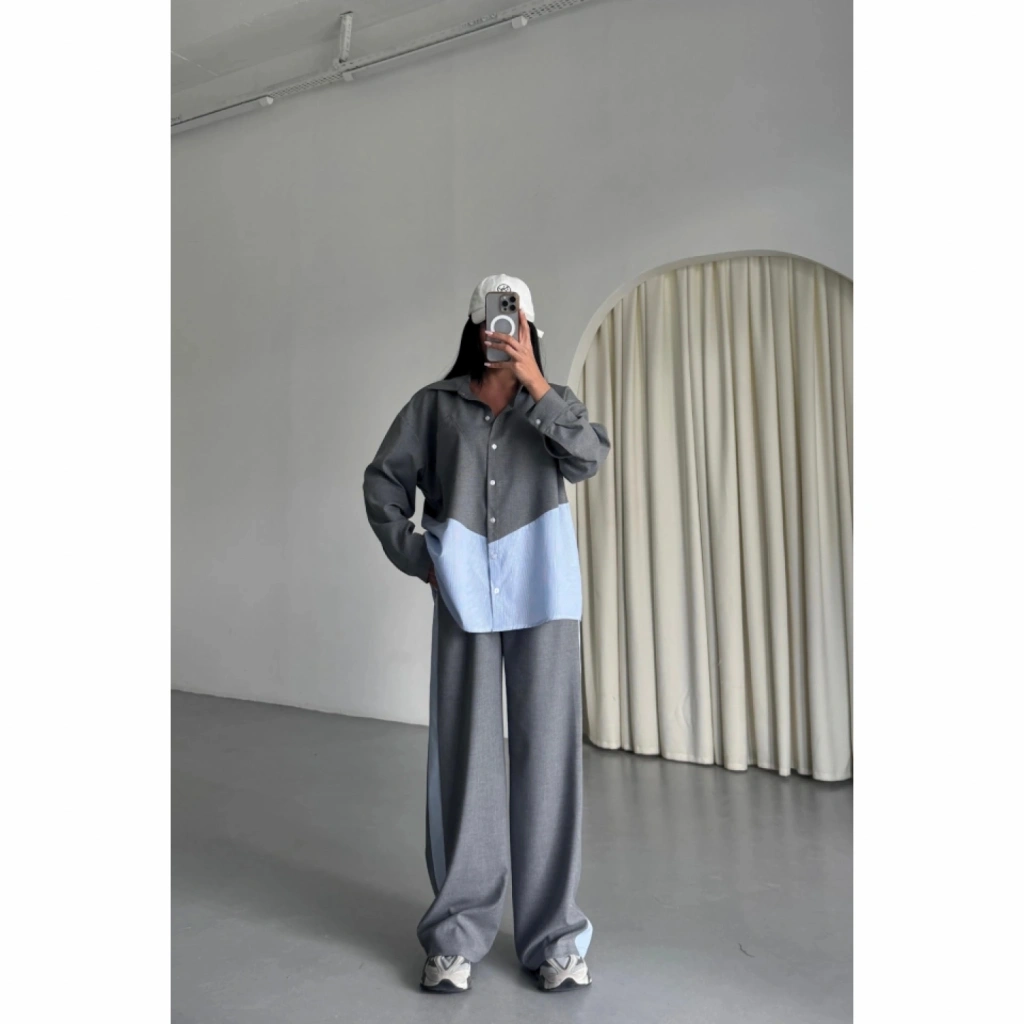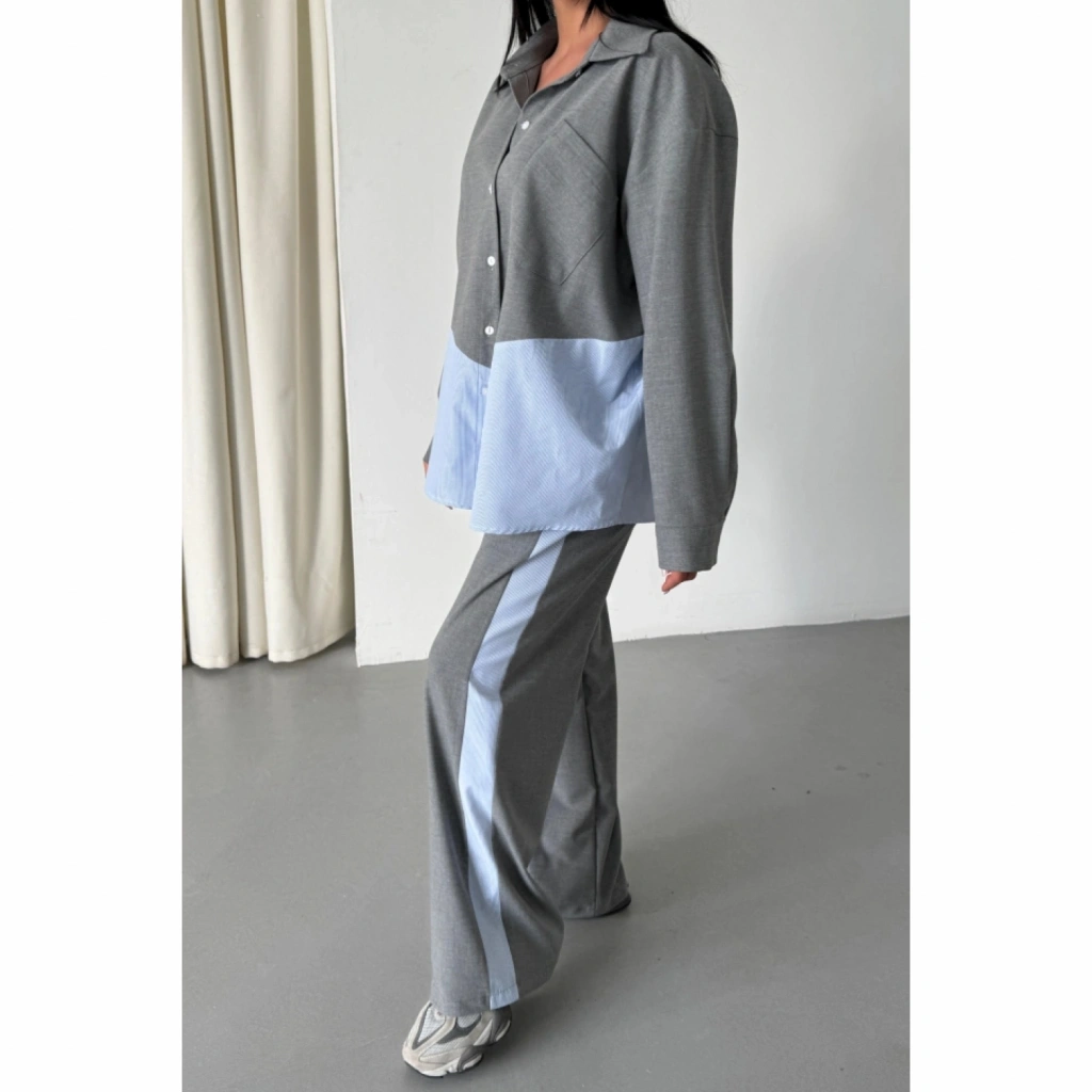 POLYVİSKON - POPLİN PARÇALI GÖMLEK PANTOLON TAKIM - Gri