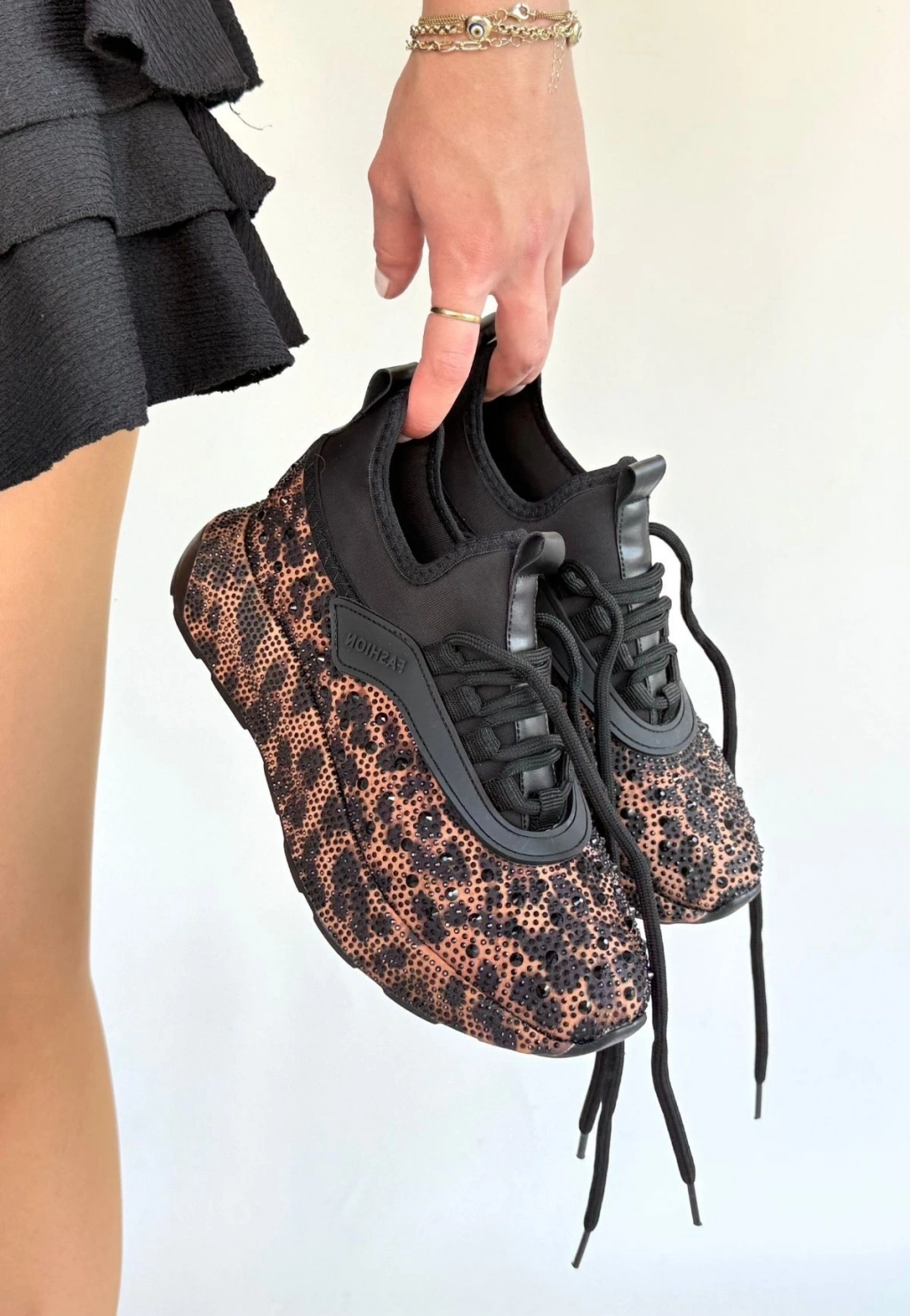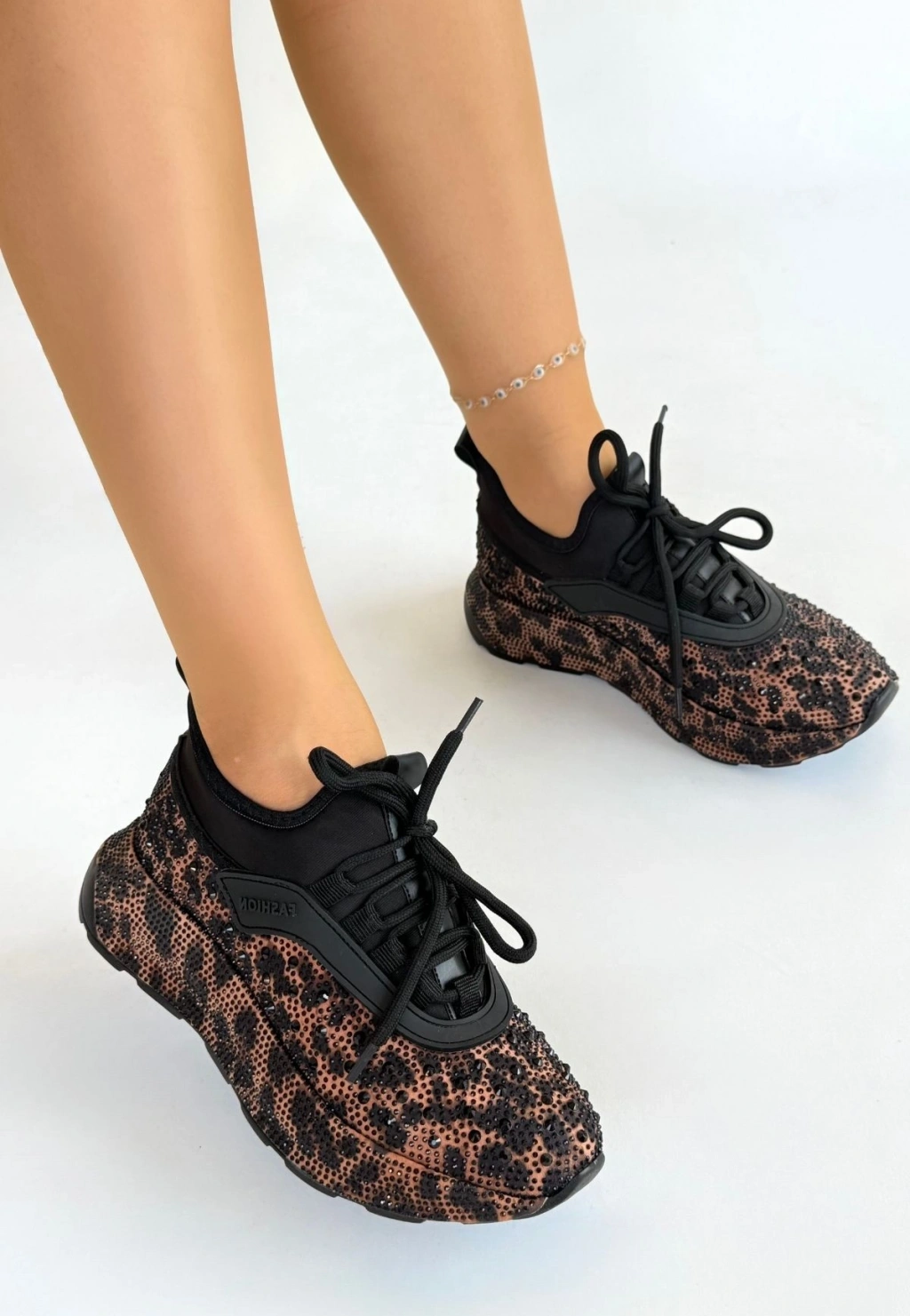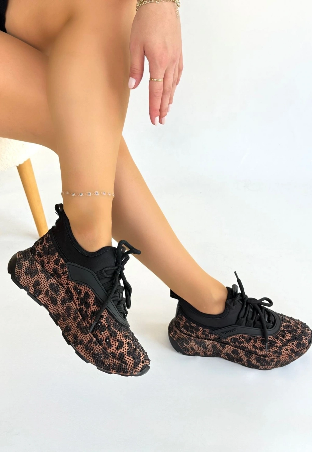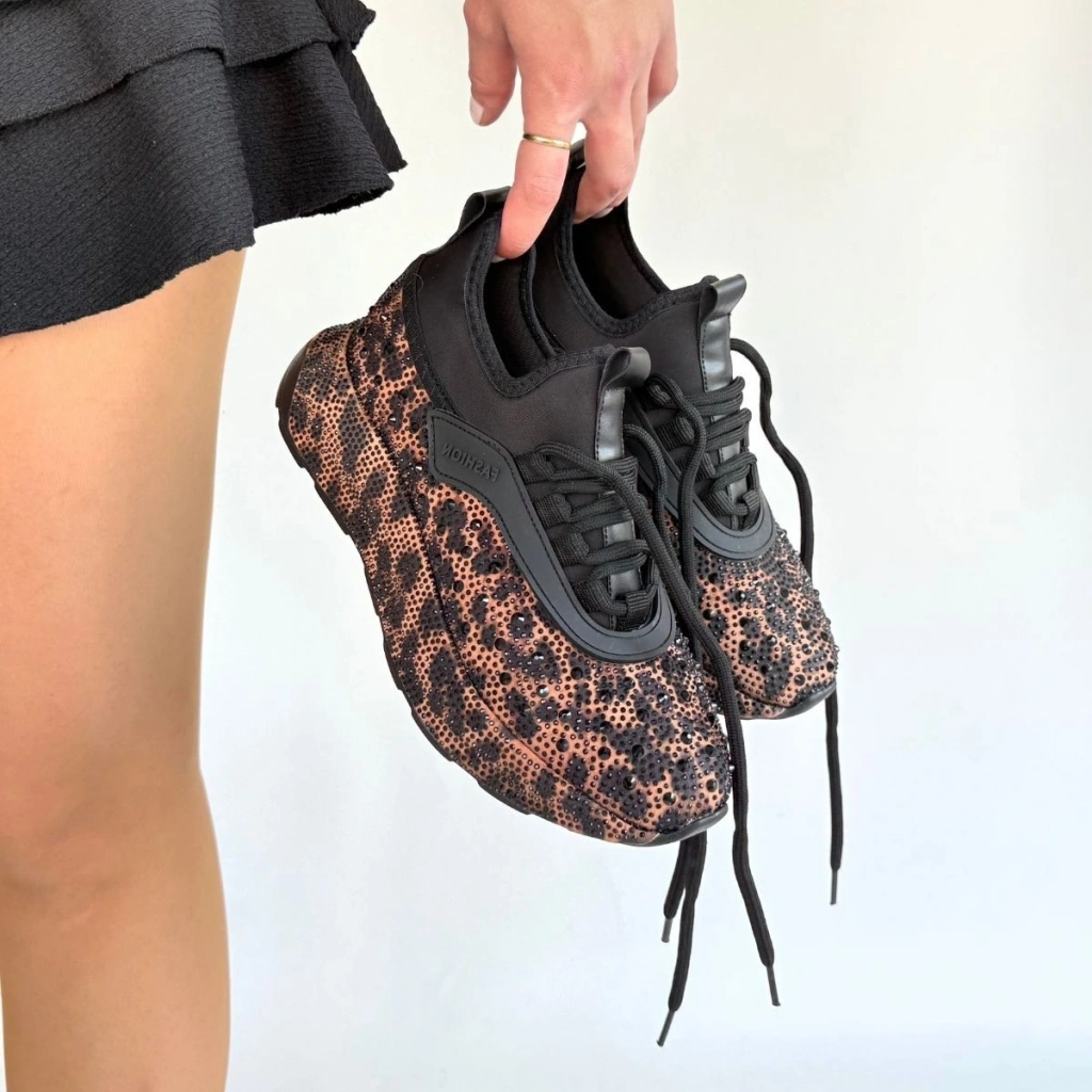 Rimay Kahverengi Leopar Boncuk İşlemeli Spor Ayakkabı