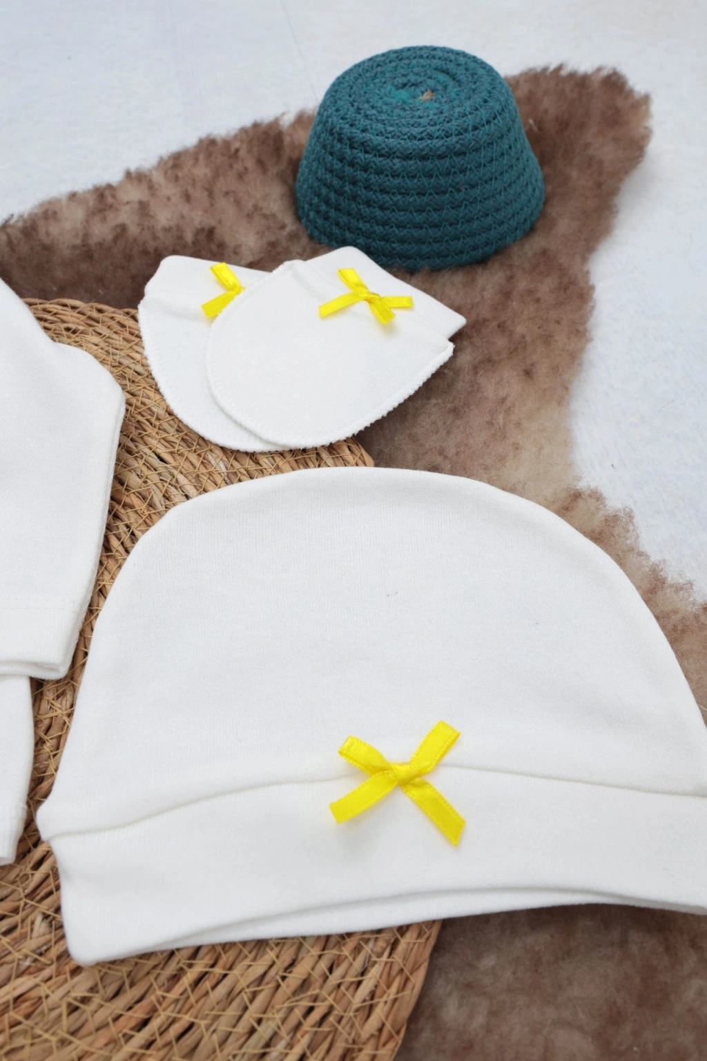 Paket İçeriği: 1 Adet Çıtçıtlı bebek Ceketi, 1 adet Patikli Pantolon, 1 adet Şapka, 1 adet lastikli Önlük, 1 çift Eldiven