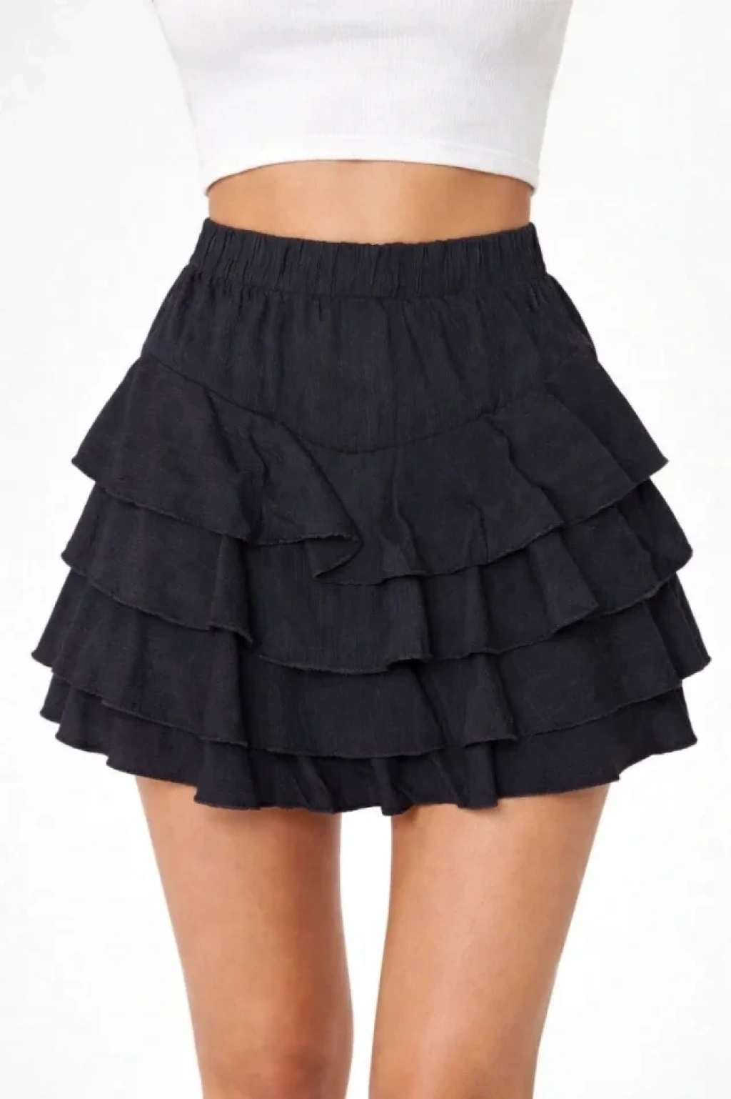 Siyah Katlı Mini Fırfıtlı Etek Lastikli Yüksel Bel, Volanlı Tasarım, Rahat Kalıp, Günlük Ve Şık Kombinelere Uygun Yazlık Etek - Siyah