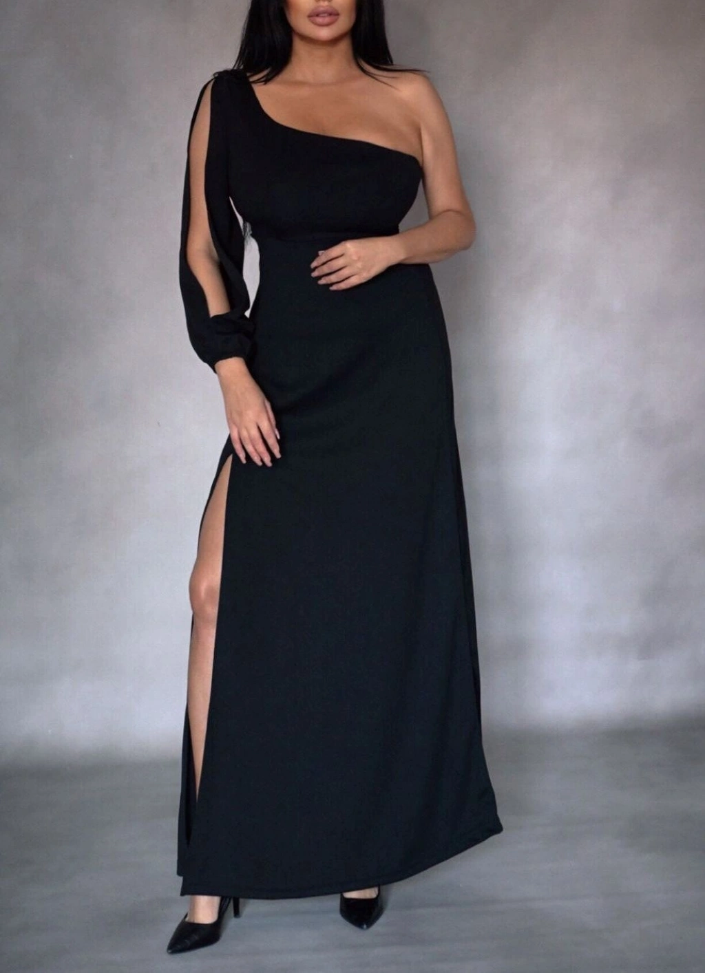 Tek Omuz Açık Derin Yırtmaçlı Krep Tam Boy Elbise