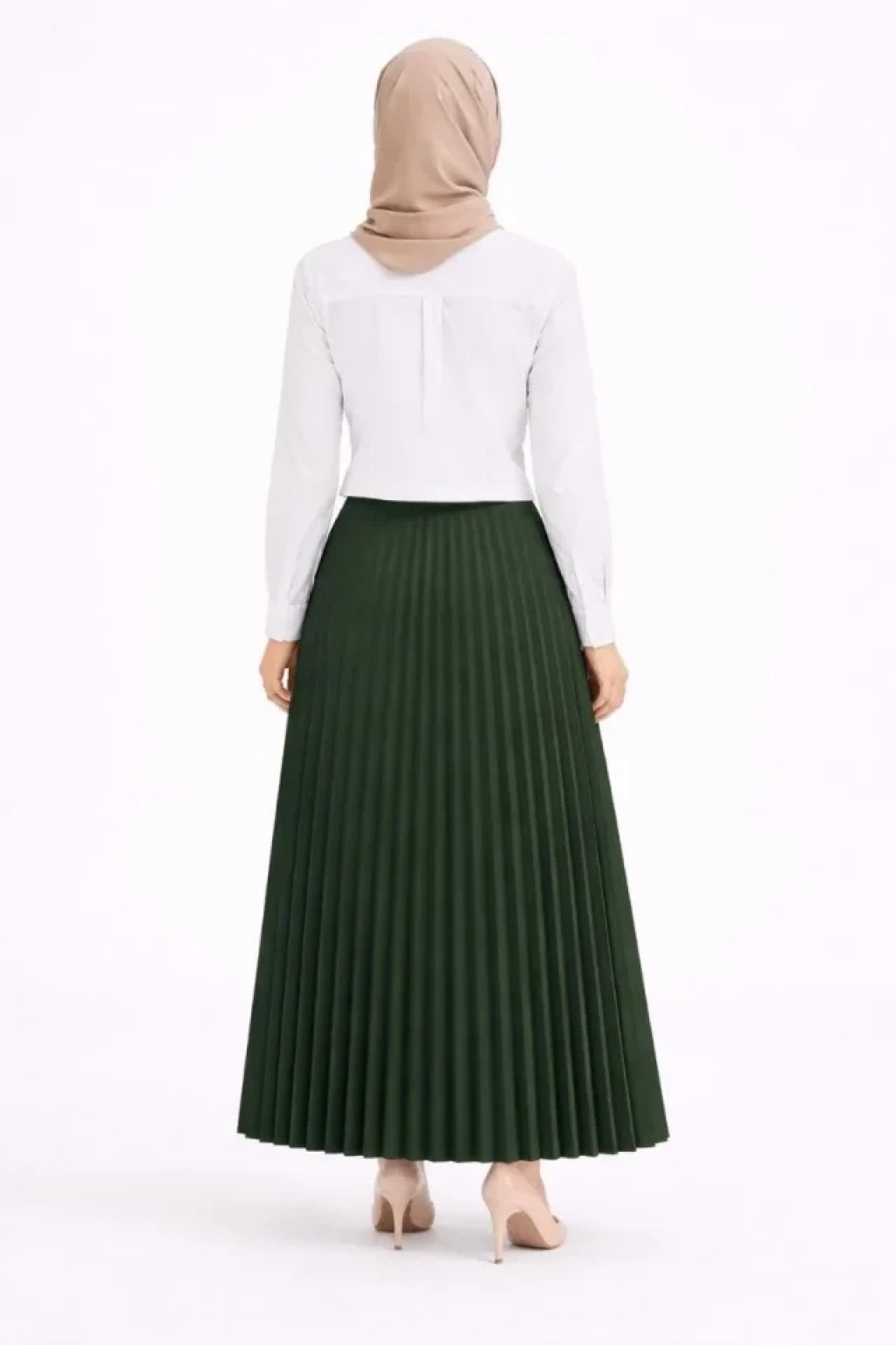 Tesettür Beyaz Gömlekli Pliseli Etek İkili Takım Gündelik Ve Ofis Şıklığı - Çağla Yeşili