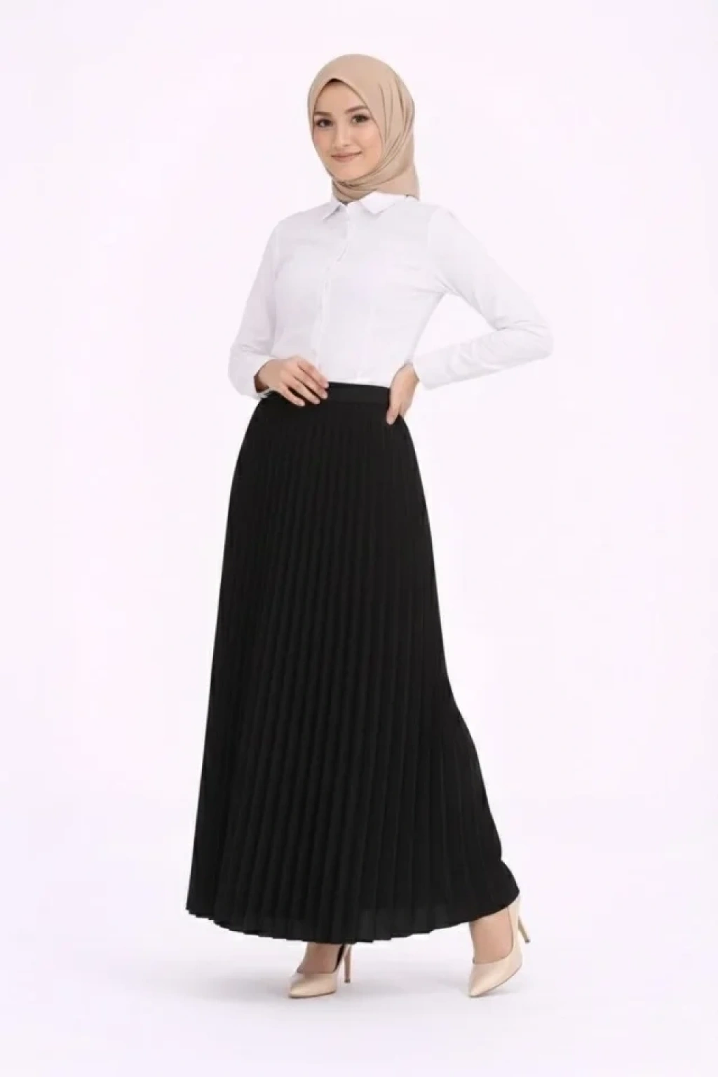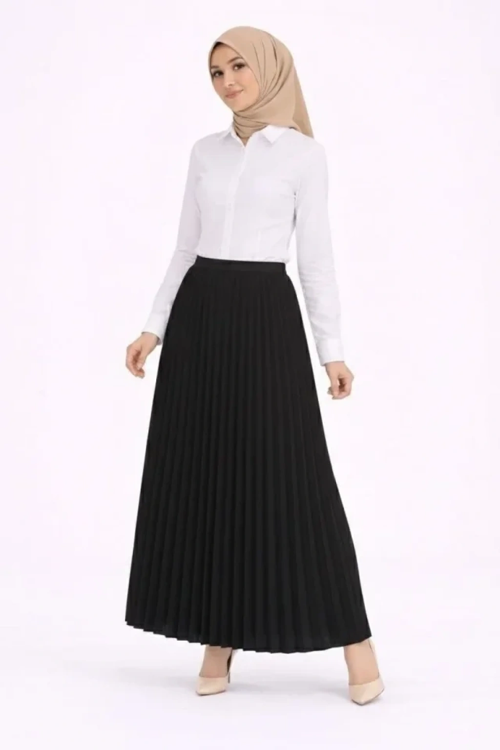 Tesettür Beyaz Gömlekli Pliseli Etek İkili Takım Gündelik Ve Ofis Şıklığı - Siyah