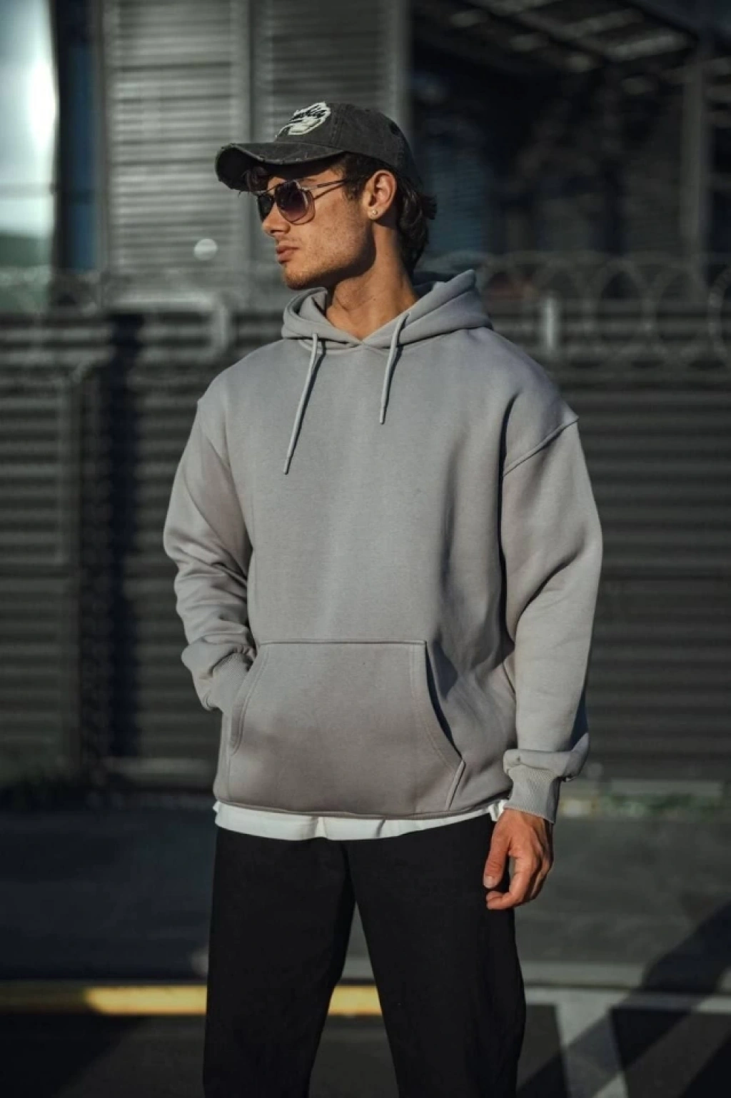 Üç İplik Penye Kapşonlu Basic SweatShirt - Boyalı Gri