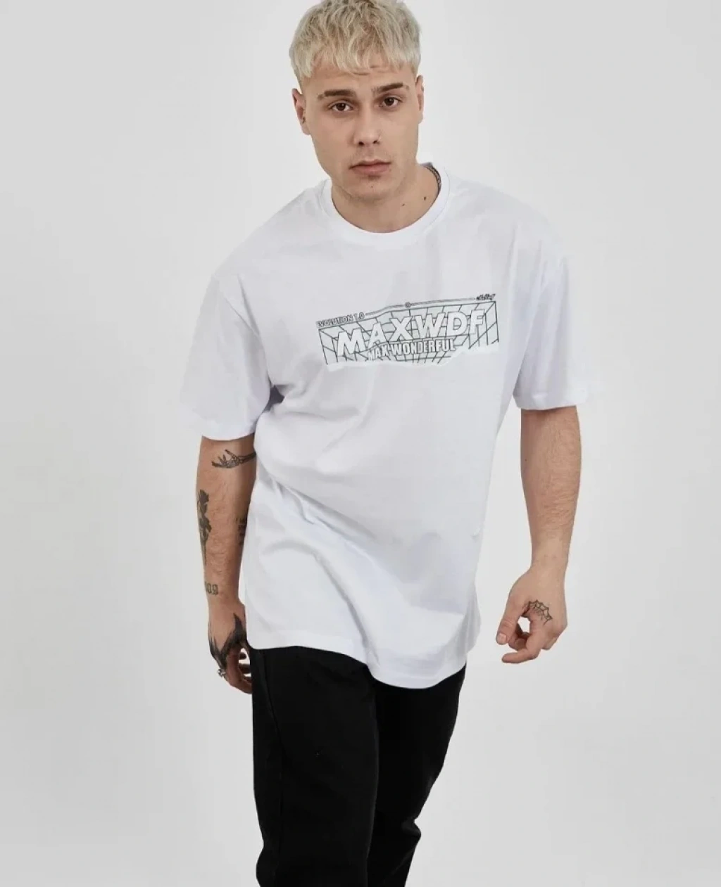 Unisex Bisiklet Yaka Baskılı Oversize T-Shirt - Beyaz