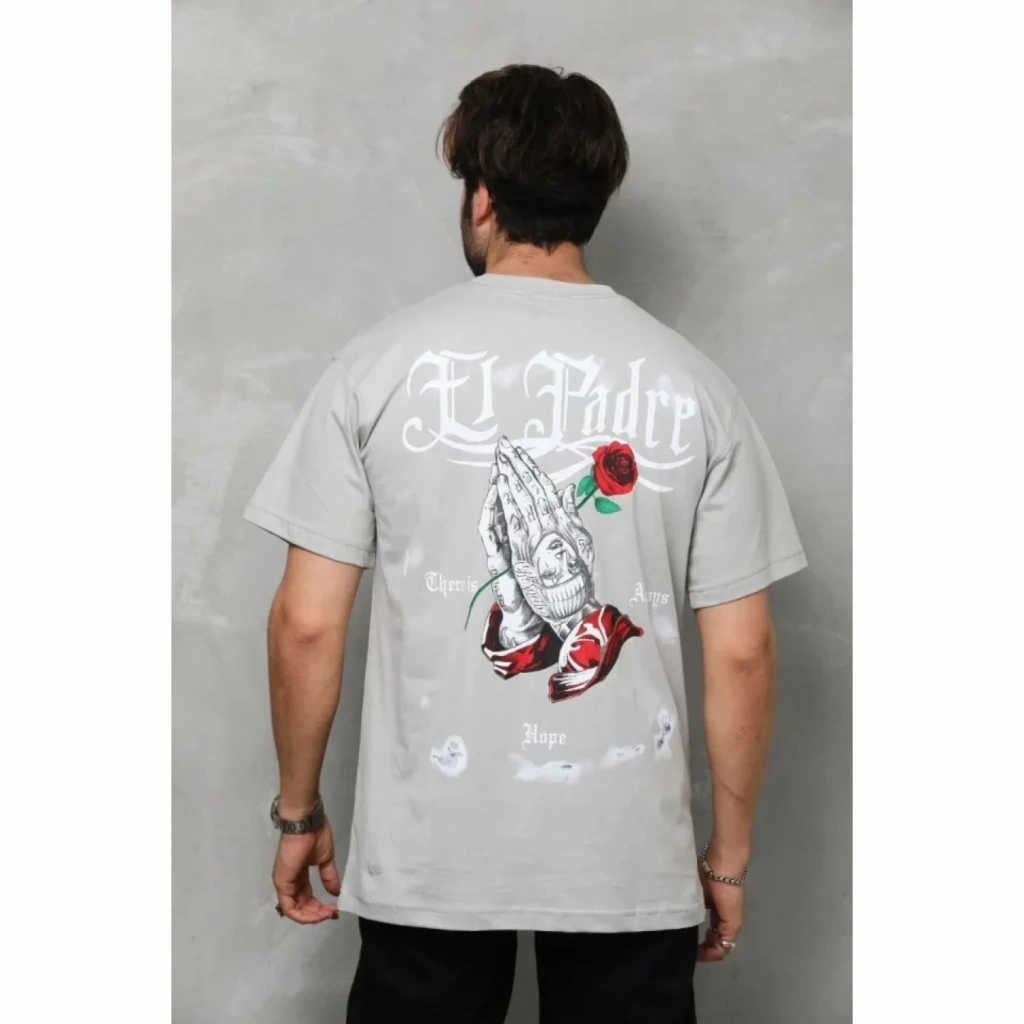 Unisex Bisiklet Yaka Baskılı Oversize T-Shirt - Gri