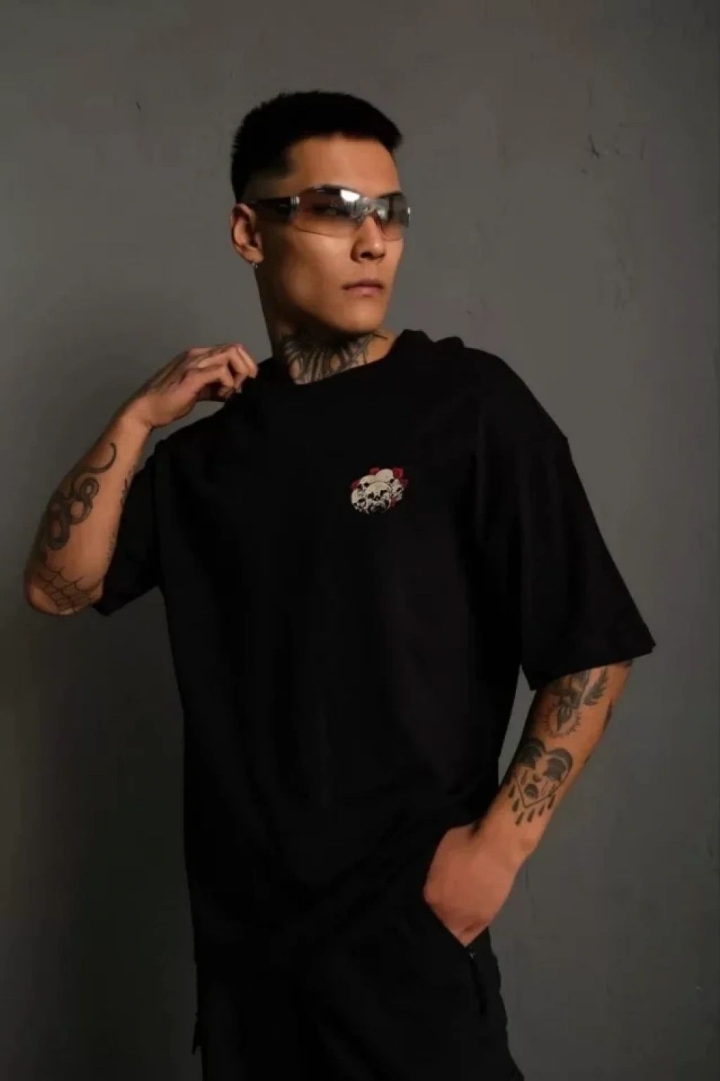 Unisex Bisiklet Yaka Baskılı Oversize T-Shirt - Siyah