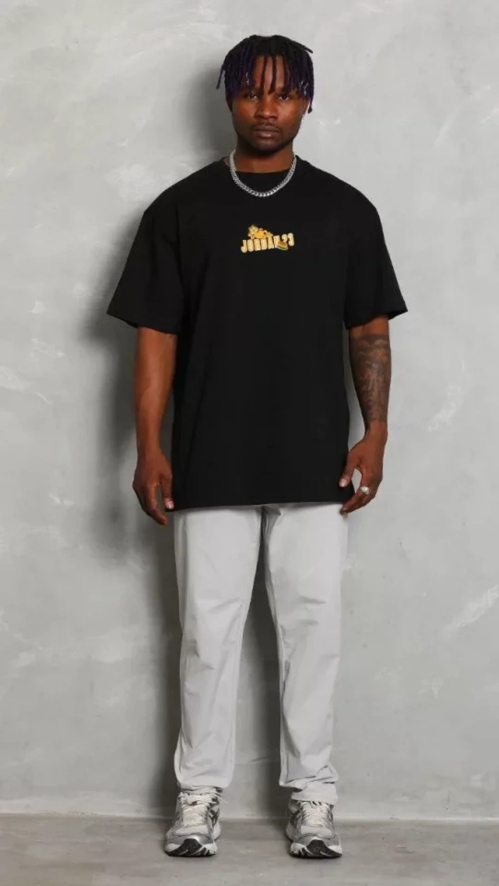 Unisex Bisiklet Yaka Baskılı Oversize T-Shirt - Siyah