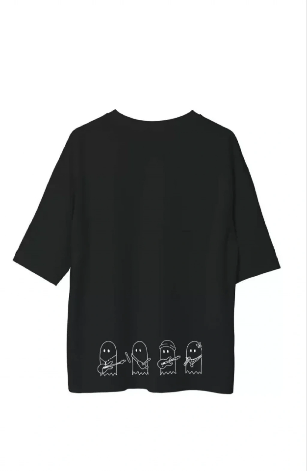 Unisex Bisiklet Yaka Baskılı Oversize T-Shirt - Siyah
