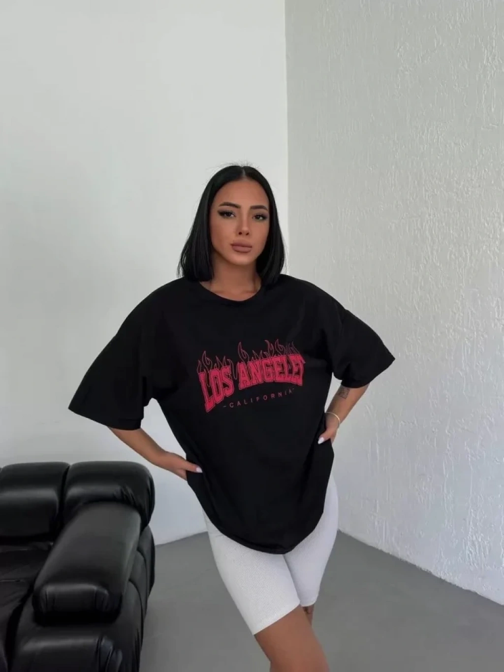 Unisex Bisiklet Yaka Baskılı Oversize T-Shirt - Siyah
