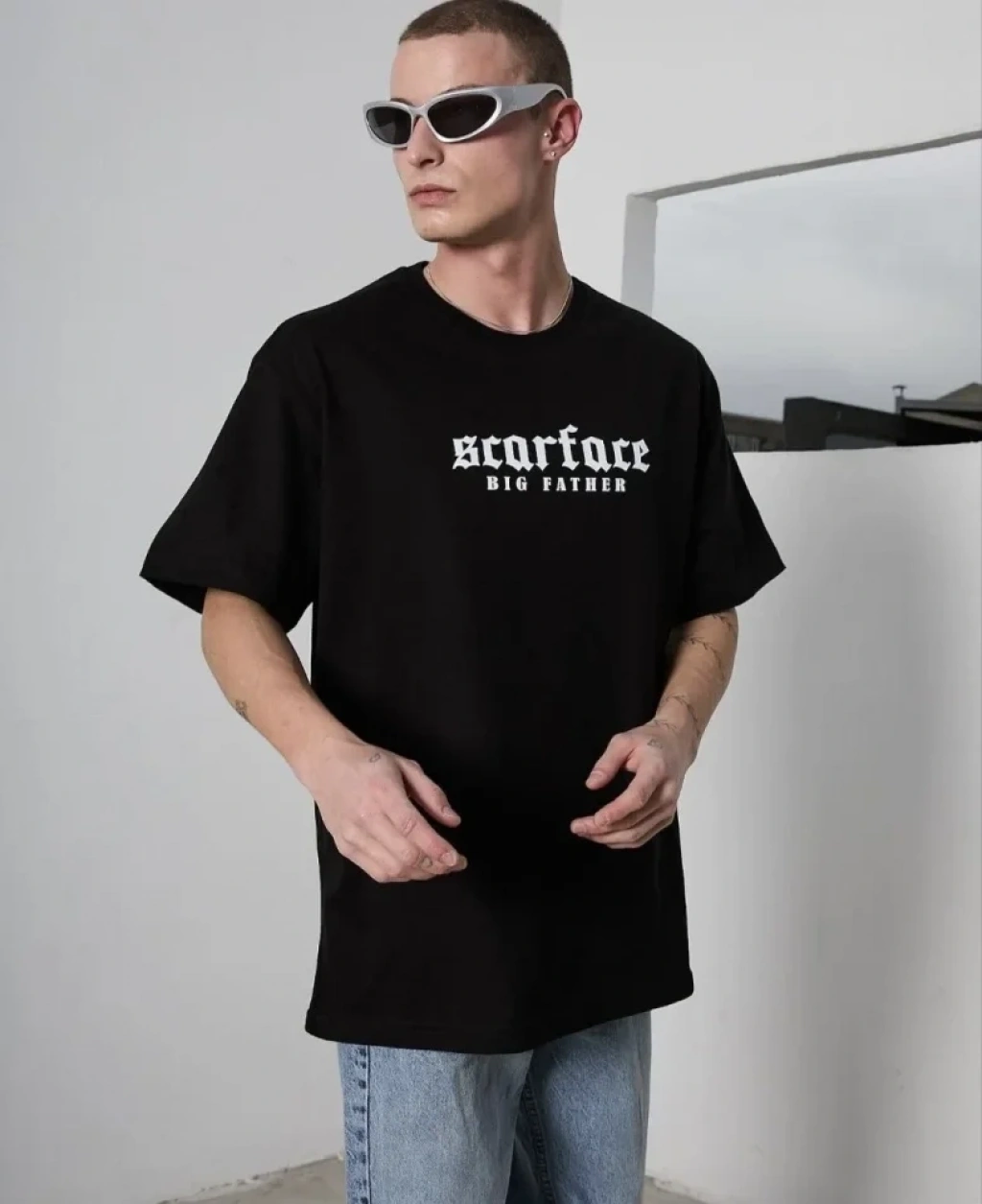 Erkek Melek Baskılı Oversize T-shirt - Siyah