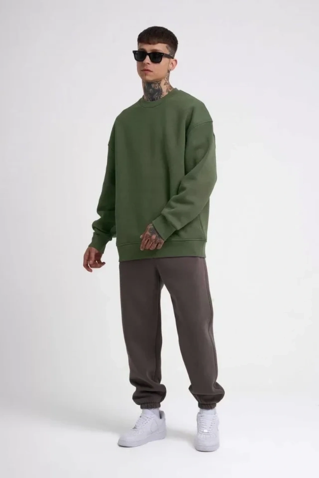Unisex Biskilet Yaka Üç İplik SweatShirt - Haki
