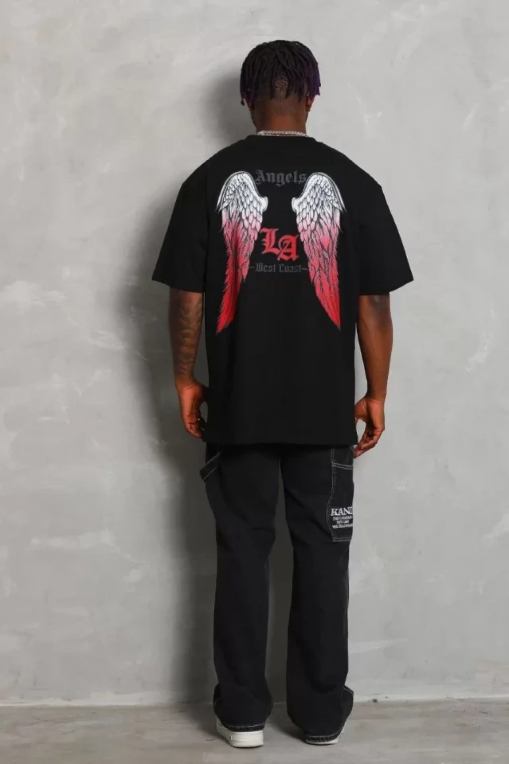 Erkek Melek Baskılı Oversize T-shirt - Siyah