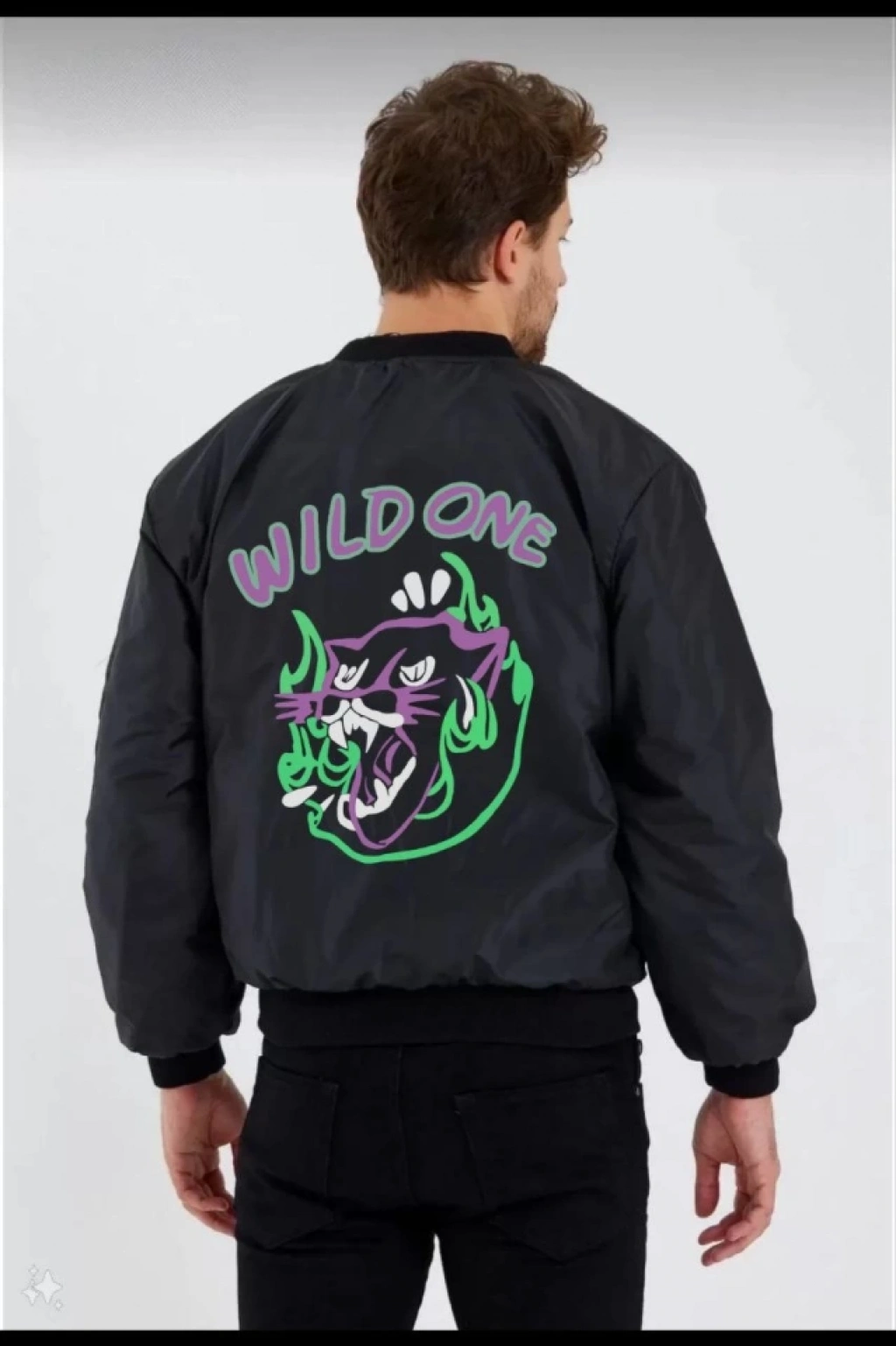 Unisex Uzun Kol Baskılı Bomber Ceket - Siyah